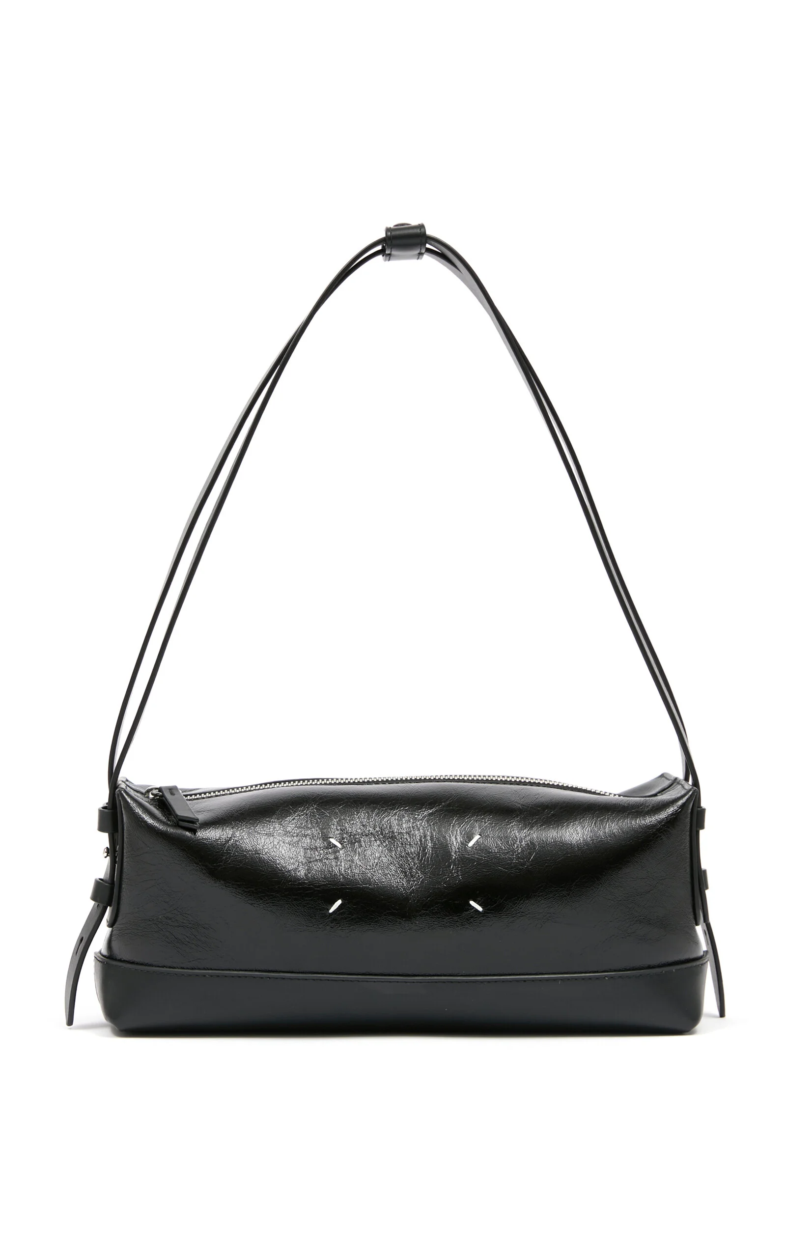 Radical conceptual designer Martin Margiela founded his eponymous couture house in 1988 and quickly established himself at the forefront of the Belgian fashion avant-garde. This small baguette has an East/West silhouette made from wrinkled glossy leather with two top handles that can adjust to a longer length. Completed with the Maison’s signature four stitches. PRODUCT DETAILS - Zip fastening - Composition: 100% calf leather; Hardware: 100% brass; Hardware: 100% zama - Made in Italy
