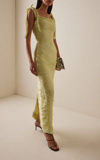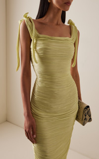 Based in Dubai, Marmar encapsulates Eastern and Western cultures, creating garments that resonate with a global audience. Each piece that MH designs is a testament to meticulous craftsmanship, ensuring each garment is a work of art. 'Roseya' is a hand-pleated draped satin-like gown with bow straps. PRODUCT DETAILS - Pre-Fall '25 - Zip fastening along back - Composition: 100% silk - Designer color: Butter Yellow - Dry clean - Imported SIZE & FIT - Our model is wearing a size EU 32 - Model is 5'10" with a 30" bust, 24" waist, and 34" hip