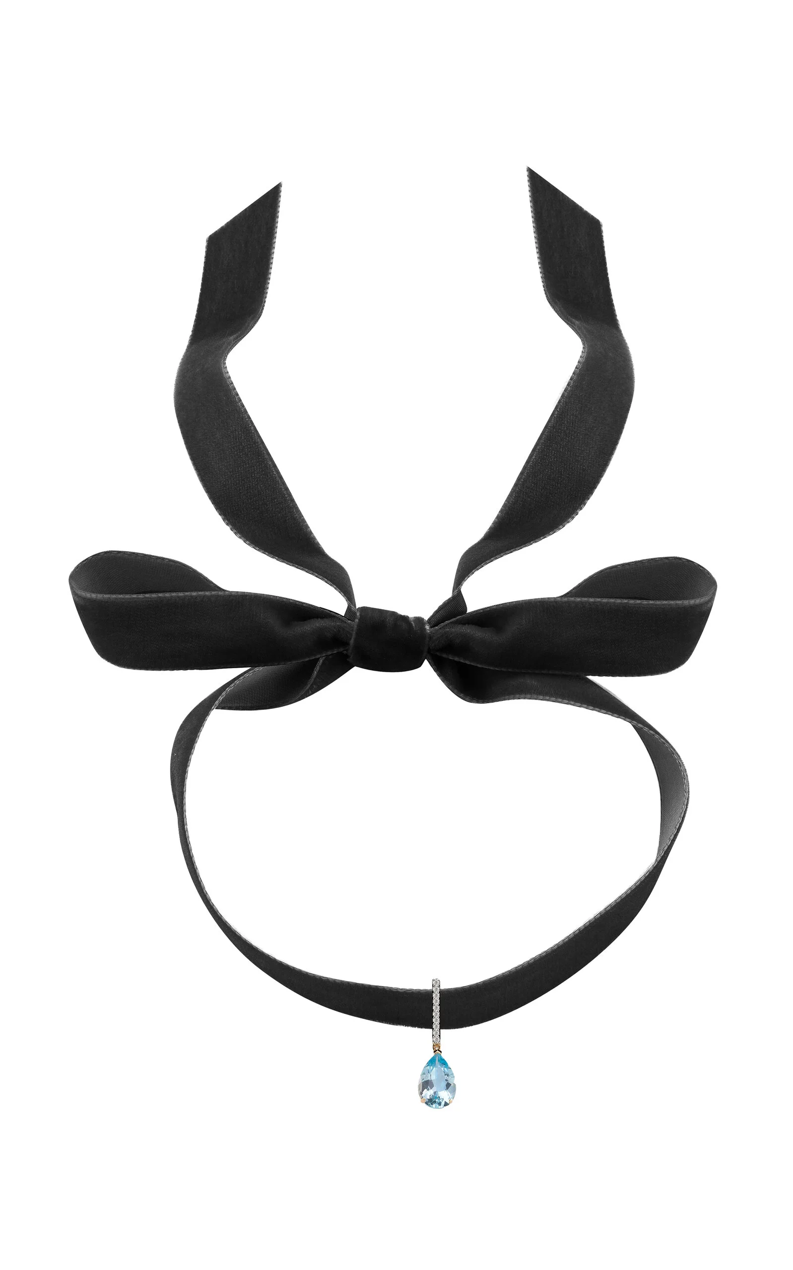 Drawing inspiration from the world of modern art and design, NYC-based brand Mateo crafts minimalist fine jewelry for the stylish contemporary woman. Beautifully handmade in New York City of solid 14K yellow gold, diamonds and Swiss Blue Topaz. This choker is the essence of femininity and romance. The pendant sits elegantly on the finest french velvet. PRODUCT DETAILS - Clasp fastening - Composition: 14k yellow gold 1.55g, 0.14ct diamonds 8.84ct Swiss blue Topaz, French velvet - Made in New York - Please note the possibility of natural inclusions in gemstones
