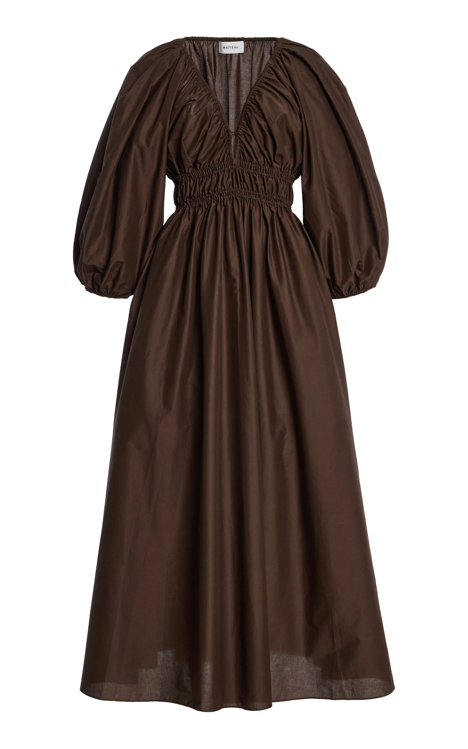 The Australian sister duo delivers their signature vacation-ready minimalism, with a focus on comfort and ease. A comfortable and flattering midi style dress, featuring three-quarter length voluminous sleeves with elasticated hem, a deep V neckline featuring a single button and loop closure and inseam pockets at the hip to create ease and comfort. Perfectly paired with a strappy sandal for a summer's day. PRODUCT DETAILS - Spring '26 - Button fastening - Composition: 100% organic cotton - Designer color: Chocolate - Dry clean - Imported