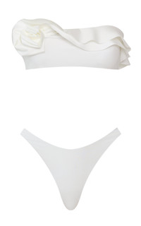 The Colombian talent continues to set a new bar in considerate design with her latest lineup of locally handmade swimwear and beachy dresses. In her signature swim fabric, with memory-shape technology that truly flatters every figure, this season’s are elevated with the couture-inflected details that make her pieces so special. The 'Bies' bikini has a bandeau silhouette with a cheeky bottom. The rosette detail is a brand signature. PRODUCT DETAILS - Pre-Fall '25 - Slip on - Composition: 78% polyamide, 22% elastane - Machine wash - Made in Colombia SIZE & FIT - Our model is 5'10" with a 30" bust, 24" waist, and 34" hip - One size only. This style comfortably fits those who are between a size XSmall-Large - Designed for minimal coverage