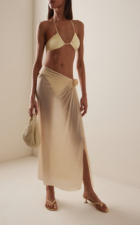 The Colombian talent continues to set a new bar in considerate design with her latest lineup of locally handmade swimwear and beachy dresses. The 'Pollera' skirt has a sarong silhouette made from its signature swim fabric with memory-shape technology that truly flatters every figure. The rosette detail is a brand hallmark. Complete the look with the matching top. PRODUCT DETAILS - Spring '26 - Slip on - Composition: 77% polyamide, 23% elastane - Designer color: Macadamia - Hand wash - Made in Colombia