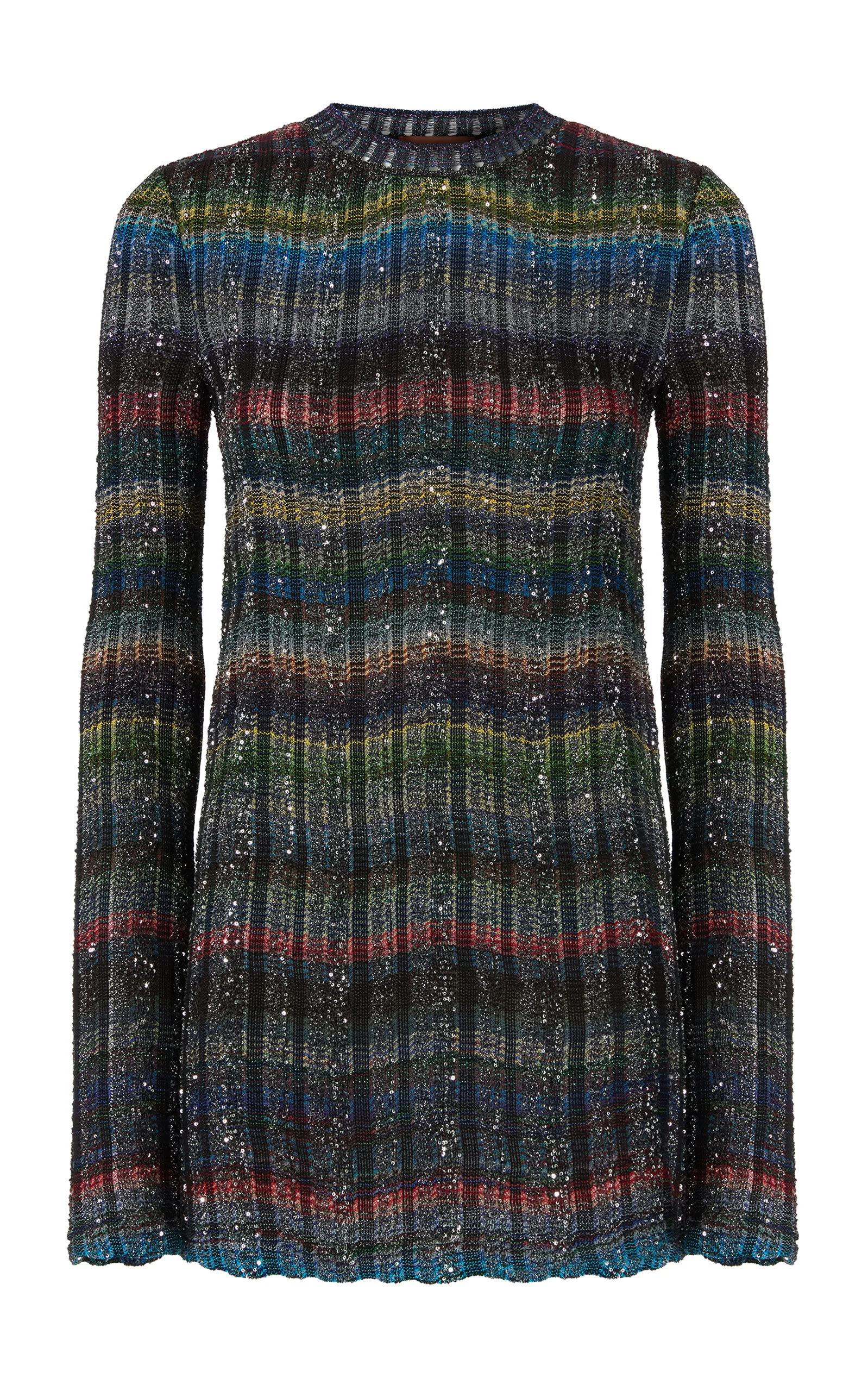 PRODUCT DETAILS - Slim fit, rounded neckline with subtle flared long sleeves, wavy checkered detailing throughout - Pull Over - Composition: 14%Polyamide, 24%Cotton, 3%Polyester, 7%Metal Fiber, External:52%Rayon - Color: Multicolor Tones - Dry Clean Only - Fall-Winter '25