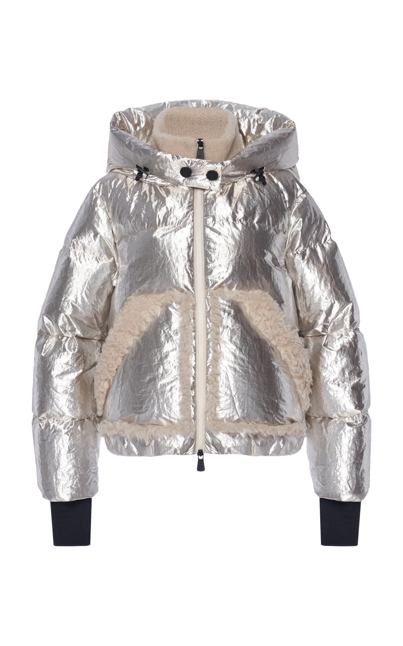 Named for the popular Monestier-de-Clermont ski resort in the French Alps, Moncler Grenoble is a leader in performance skiwear that utilizes its mountaineering expertise to craft designs that fuse fashion and function. A sophisticated piece for apres ski, the Trevelin short down jacket is crafted from lame with a shiny finish. The hooded puffer is further enhanced by a shearling collar and trim, enhancing moments of winter leisure with a luxurious note. Adding protection, a powder skirt completes the warmer. PRODUCT DETAILS - Suitable for sporting conditions - Zip fastening through front - Composition: 53% metallized fiber, 47% polyester; Lining: 100% nylon; Padding: 90% down, 10% feather; Details Padding: 100% polyester; Material: 83% nylon, 17% spandex; Trim: sheepskin - Specialist clean - Made in Italy SIZE & FIT - Our model is wearing a size 1 - Model is 5'9" with a 31" bust, 22" waist, and 35" hip - Designed for a regular fit