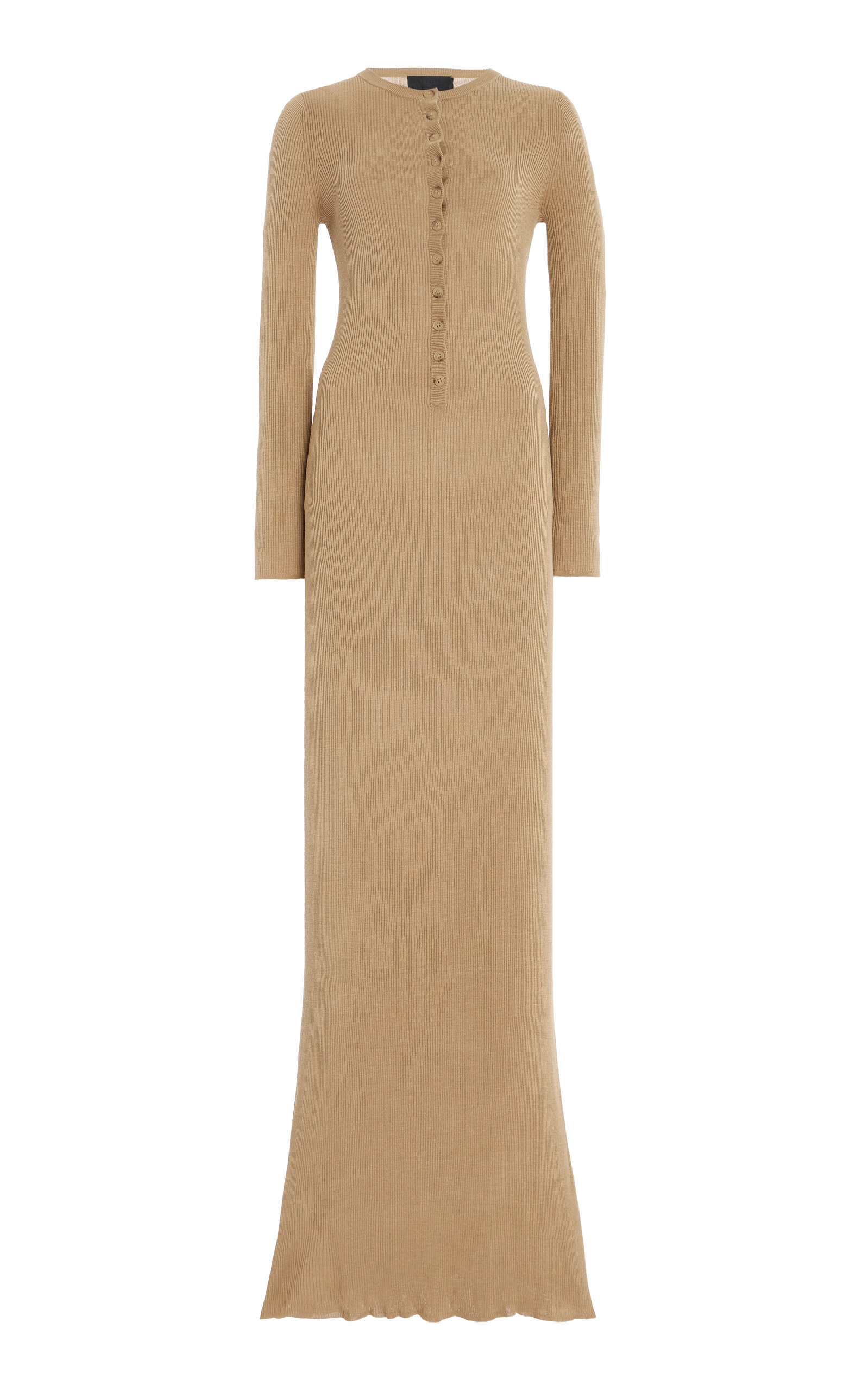 NYC designer Nili Lotan is a favorite for downtown urbanites thanks to her fuss-free sophistication, which balances a cool ‘70s edge with sensual ease. As a diehard minimalist, this season builds on her typically stripped-back aesthetic. The 'Roxy' is spun from silk to a slinky ribbed-knit with accentuating stretch. Its long sleeves and floor-length hem complete the sweater dress. PRODUCT DETAILS - Pre-Fall '25 - Partial button fastening through front - Composition: 100% Silk - Designer color: Camel - Dry clean only - Made in the USA SIZE & FIT - Our model is wearing a size Small - Model is 5'11" with a 32" bust, 25" waist, and 35.5" hip - Designed for a slim fit
