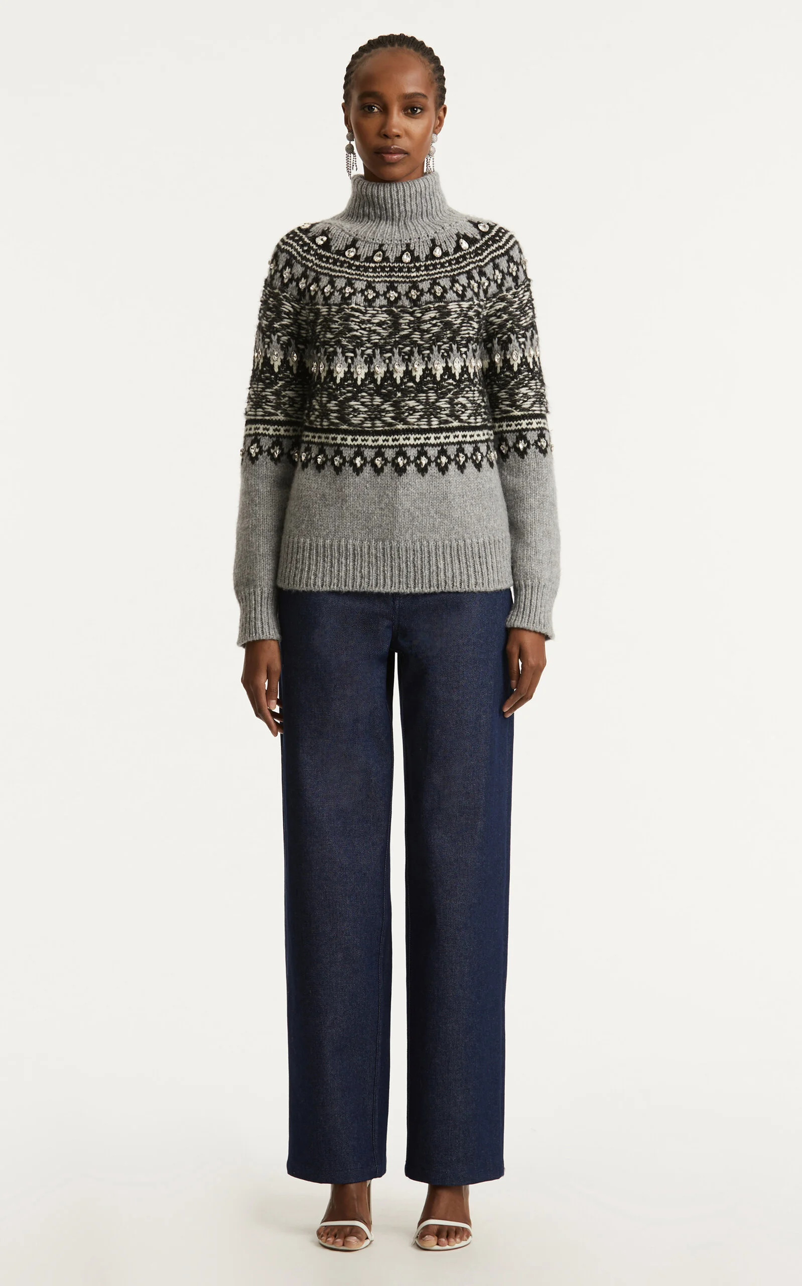 Crystal-Embellished Fair Isle Turtleneck Sweater grey