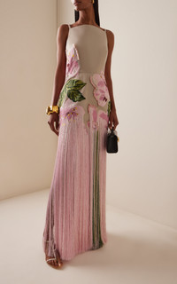 PRODUCT DETAILS - Sleeveless, embroidered, long fringed trim, maxi hem - Concealed zip fastening - Lined - Composition: Emb Base/Self: 100% Silk; Lining: 100% Polyester - Color: Pewter - Dry clean only - Pre-Fall '25