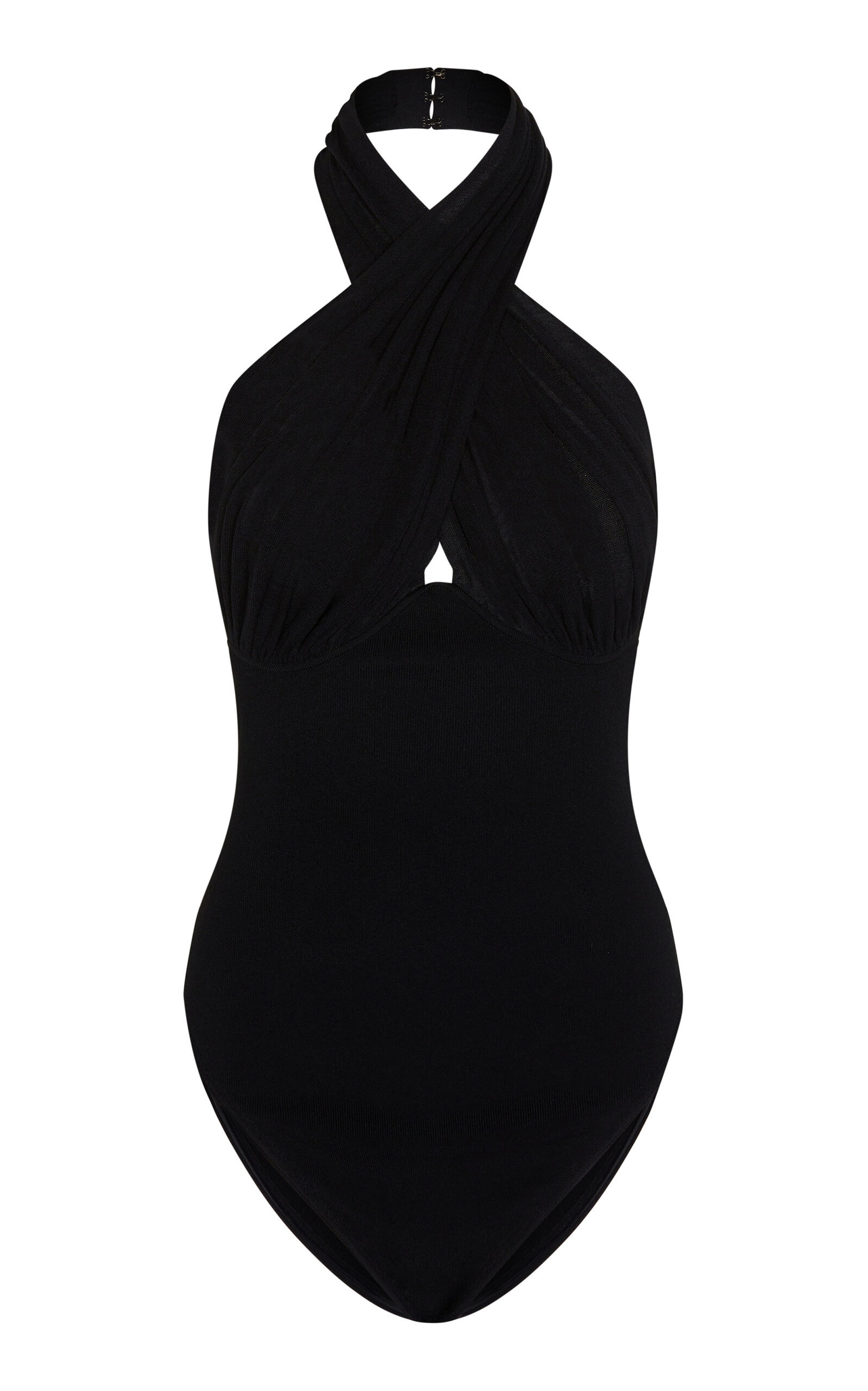 KNITWEAR PRODUCT DETAILS - Fall-Winter '25 - Slim fit, deep V neckline with draped halter straps, backless cutout - Lined - Composition: 83% Viscose 17% Elite/ Contrast: 90% Viscose 10% Nylon - Snap Button Closure - *Dry clean only - Made in China