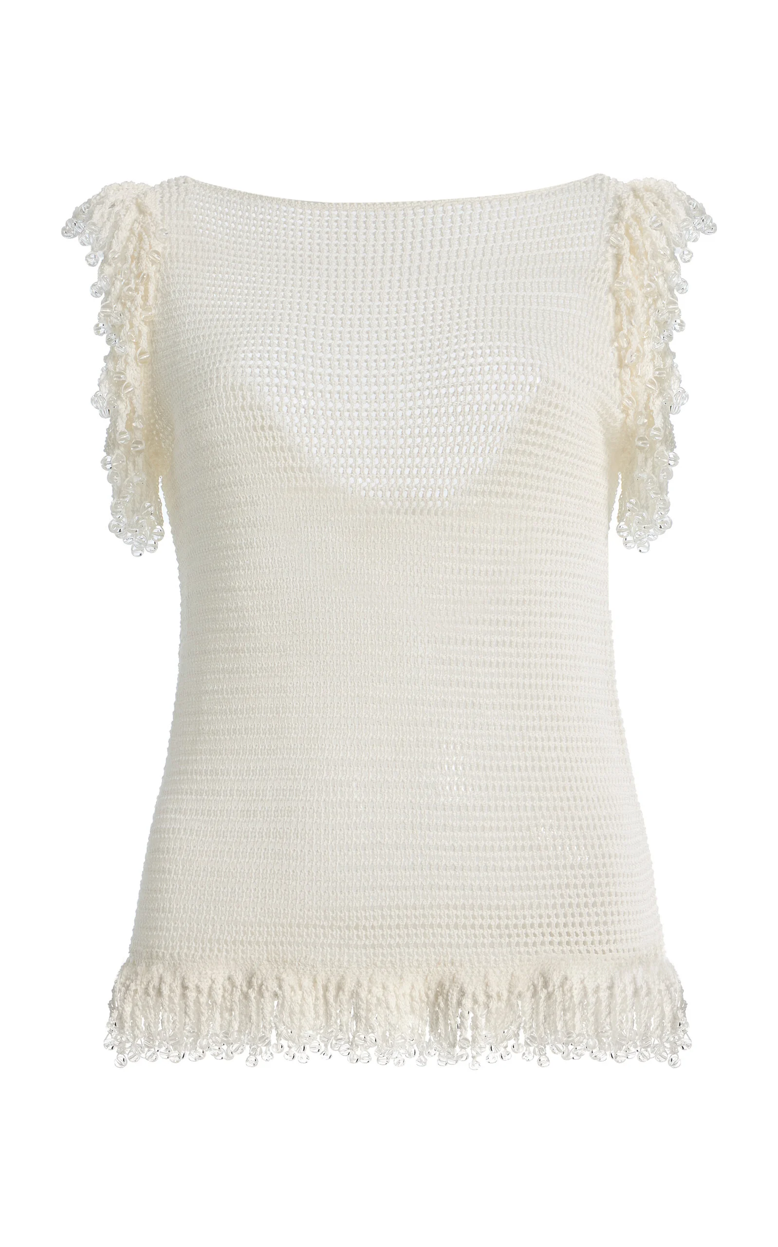 Essentials this cool are hard to come by—then again, you’d be hard-pressed to find a cooler duo than Georgia Cherrie and Paris Mitchell Temple, the New Zealanders at the helm, who previously ran an online shop that Vogue credited with “the best vintage.” The 'Fringe' top is crafted from a crocheted-knit cotton yarn, offering a soft yet structured feel. Hand-beaded detailing at the shoulders and hem adds an artisanal finish to this refined, textural silhouette. PRODUCT DETAILS - Spring '26 - Slip on - Composition: 100% cotton - Dry clean - Imported