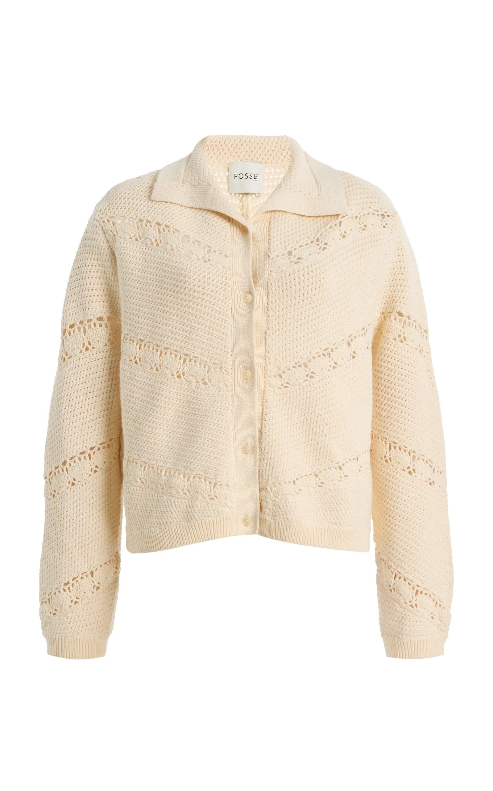 Centered on the principles of slow fashion, Aussie label POSSE is committed to producing the finest fabrications in limited quantities. Each piece is designed to be loved and worn for years to come — to be borrowed, swapped, passed down and cherished across a lifetime. The 'Dylan' cardigan has a crocheted construction with a spread collar and ribbed edges. Complete the look with the matching top and short. PRODUCT DETAILS - Spring '26 - Button fastening - Composition: 72% viscose, 28% polyester - Designer color: Pearl - Dry clean - Imported