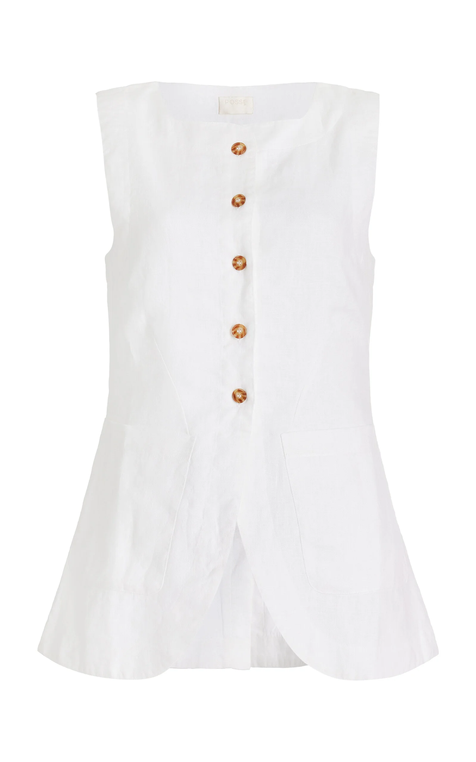 Centered on the principles of slow fashion, Aussie label POSSE is committed to producing the finest fabrications in limited quantities. Each piece is designed to be loved and worn for years to come — to be borrowed, swapped, passed down and cherished across a lifetime. The 'Emma' vest has an elongated silhouette with a high neckline made from airy linen. Wear it with the matching skirt. PRODUCT DETAILS - Button fastenings at front - Composition: 100% linen - Dry clean - Imported SIZE & FIT - Our model is 178cm/ 5'10" and wearing a size Small - Fits true to size, our fit specialist recommends taking your normal size - Designed for a slim fit