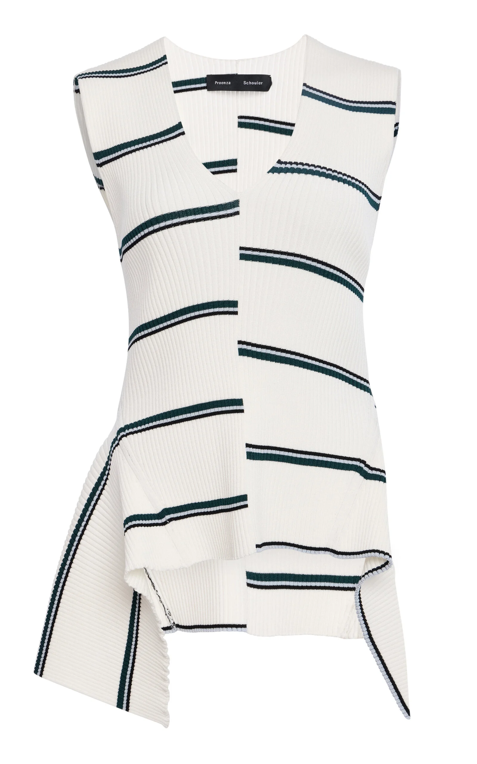 Proenza Schouler continue to do what they do best — an elevated uniform you’ll want to be seen stepping out in. Defined by a V-neckline and contrast stripe detailing, the Eugenie tank top is knit in a ribbed fabrication with a flared peplum hem, balancing a streamlined fit with subtle movement. PRODUCT DETAILS - Spring Summer '26 - Slip on - Composition: 45% acetate, 39% viscose, 8% polyester, 8% polyamide - Dry clean only - Imported