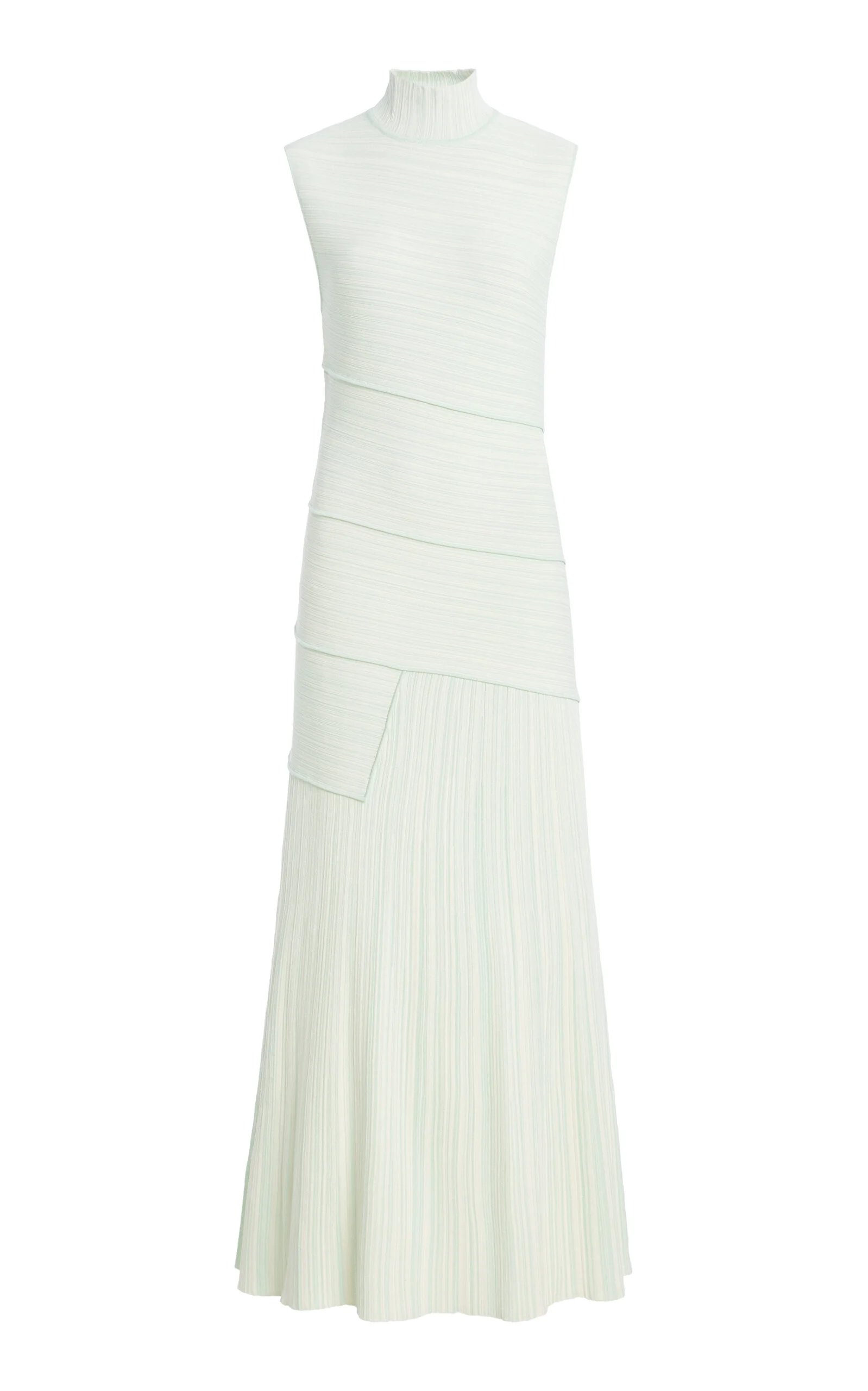 Proenza Schouler continues to evolve their signature silhouettes with irresistible updates and iterations. The Federica Dress in Micro Pleat Knit is crafted to a slim silhouette with a wrap-like effect. Features a mock neckline and a softly flounced hem. PRODUCT DETAILS - Resort ‘26 - Slip on - Composition: 48% Viscose, 38% Wool, 14% Polyester - Designer color: Mint - Dry clean - Imported