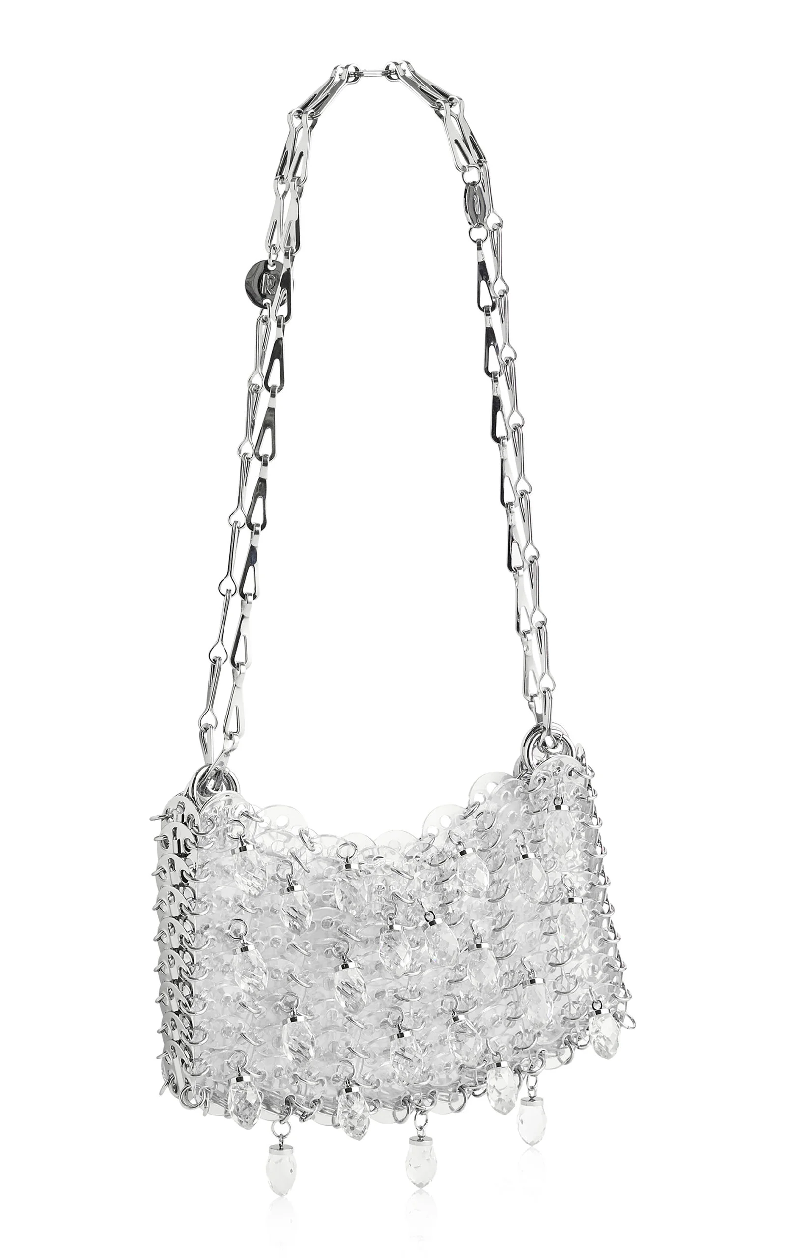 Tinged with his chic Parisian spirit, Julien Dossena returns with a lineup of jewelry and accessories in varied textures and materials that demonstrates the sensorial power of fusing contrasts. The iconic 1969 bag is one of the brand’s most illustrious accessories, recognized for its rectangular shape, layered pallets and metallic finish. This version is made from transparent resin and crystal embellishments, held together by polished silver hardware. PRODUCT DETAILS - Open top - Composition: 50% resin 30% plastic 20% steel - Imported SIZE & FIT - This item measures 19 x 11 x 3 cm