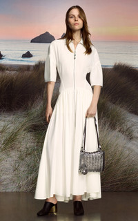 Building off of last season’s layered eclecticism, Julien Dossena channels a British beat, balancing jolts of grunge and a streetwise ease with vintage-inspired luxuries. Fitted with a dropped waist, this contemporary maxi dress is cut with a close fit bodice and a full skirt. Made with weighted crepe, this transitional piece can be worn in the late summer with heeled sandals or early fall with statement mules. PRODUCT DETAILS - Pre-Fall ‘25 - Zip fastening - Composition: 62% acetate, 38% viscose - Dry clean - Designer Color: Coconut Milk - Imported
