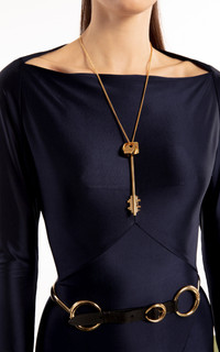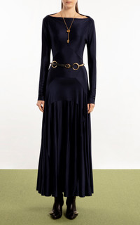 Each season, Julien Dossena builds off the last, championing Rabanne’s house codes and vintage-inspired luxuries while encapsulating our impulse to let go of tradition and try something new. This timeless maxi is made from stretch-jersey with a metallic finish. It’s cut with a boat neck, panelled dropped waist and flared skirt. Complement with gold-tone jewelry. PRODUCT DETAILS - Fall/Winter ‘25 - Button fastening - Composition: 90% viscose, 10% elastane - Dry clean - Designer Color: Deep Navy - Imported