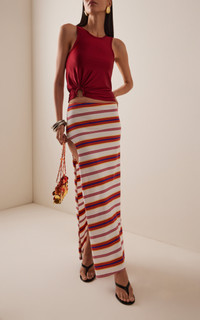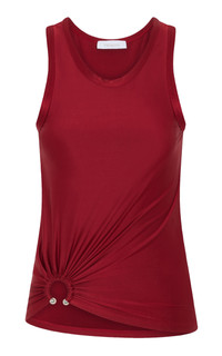 Building off of last season’s layered eclecticism, Julien Dossena channels a British beat, balancing jolts of grunge and a streetwise ease with vintage-inspired luxuries. This elevated tank top is constructed with stretch-satin and metallic hardware. The simple profile has a close fit with gathers distributed asymmetrically across the front. Tuck in to a maxi skirt or style with low-rise pants. PRODUCT DETAILS - Pre-Fall ‘25 - Slip on - Composition: 90% viscose, 10% elastane - Dry clean - Designer Color: Ruby Red - Imported SIZE & FIT - Our model is wearing a size FR 34 - Model is 5'9.5" with a 32" bust, 24" waist, and 35.5" hip
