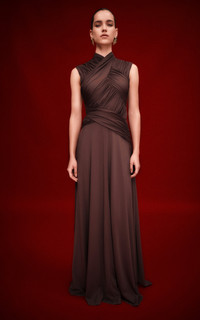 PRODUCT DETAILS - Slim fit, sleeveless, crisscross neck, ruching - Zipper fastening - Composition: 73% Polyamide, 27% Elastane - Color: Chocolate - Dry clean - Resort '26
