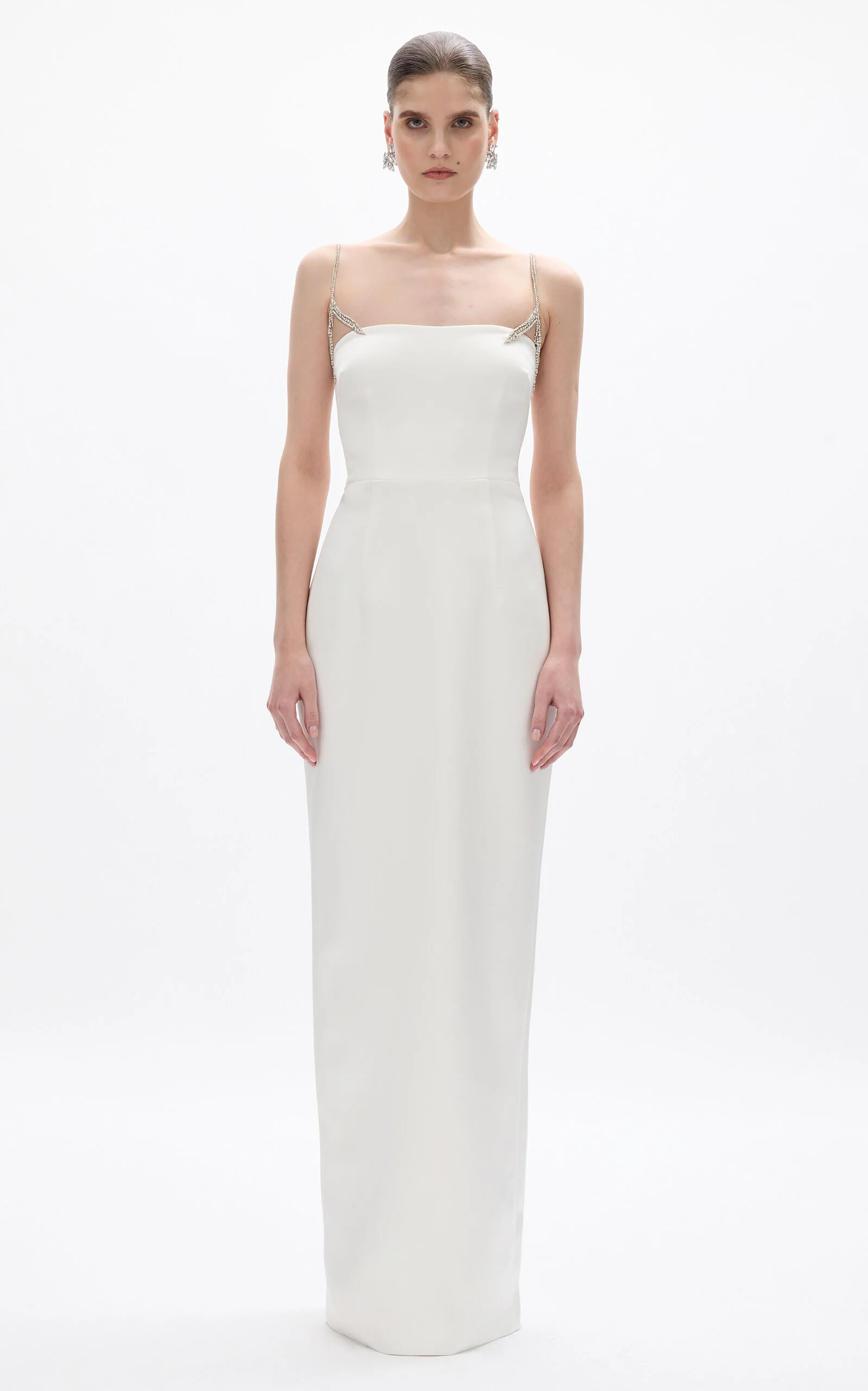 PRODUCT DETAILS - Sculpted column fit, square neckline with crystal-embellished straps, and floor-length silhouette - Concealed zip fastening - Lined - Composition: 82.3 % ACETATE 17.7% POLYESTER; Lining: 100% POLYESTER - Color: IVORY - Dry Clean Only - Spring Summer '26 - Made in China