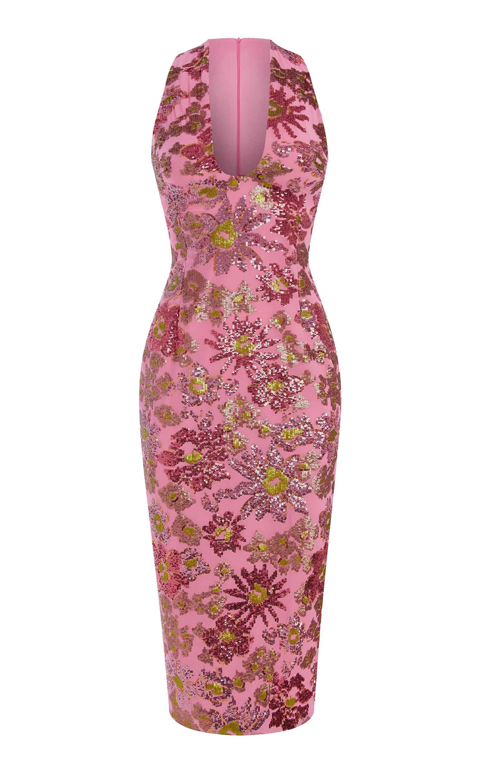 PRODUCT DETAILS - Slim fit, sleeveless, U-neck, sequin embellishments - Zipper fastening - Lined - Composition: 100% Polyester; 98% Polyester, 2% Elastane - Color: pink - Dry clean only - Spring '25