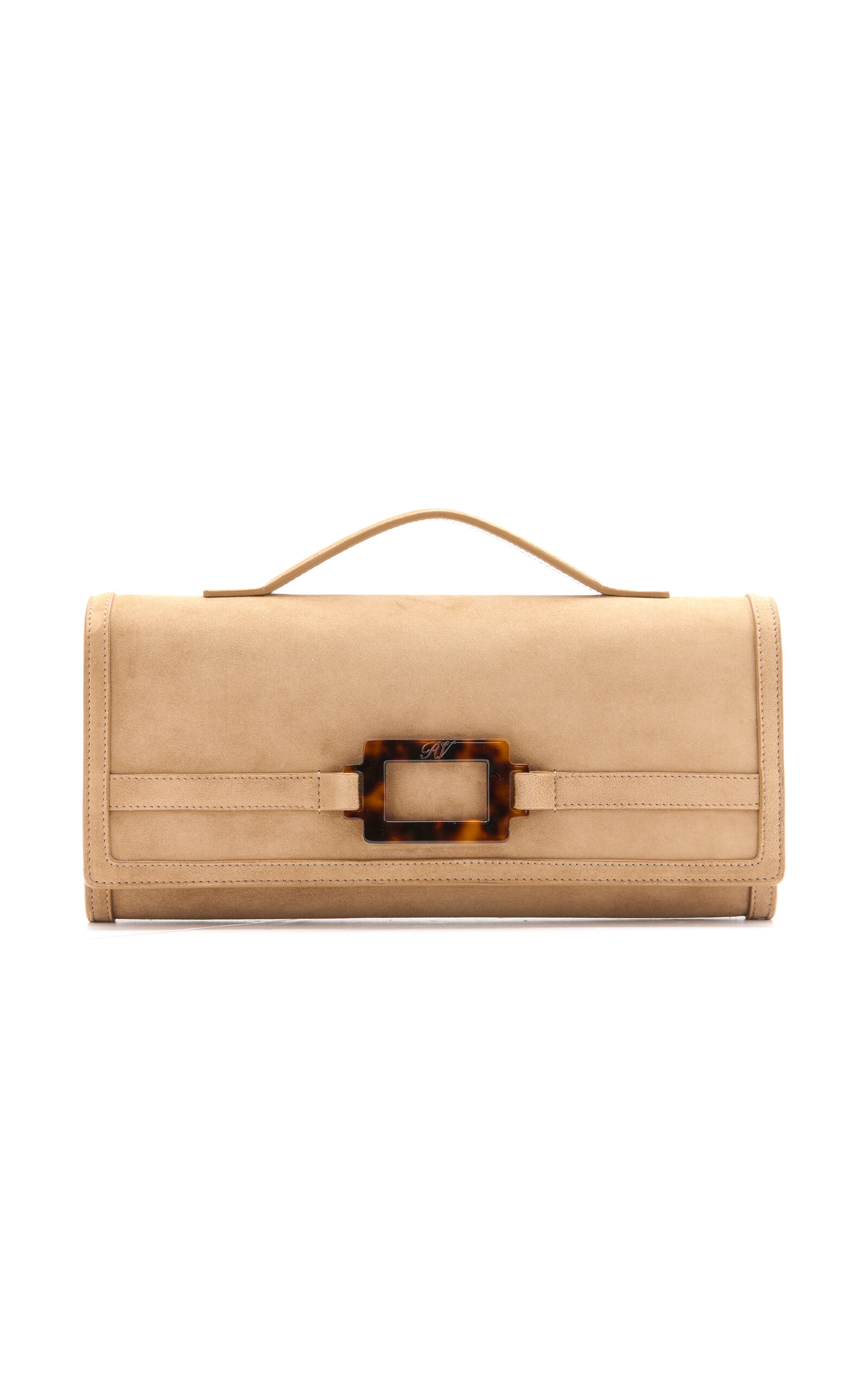Founded by the creator of the stiletto, the French heritage house boasts an illustrious legacy that Creative Director Gherardo Felloni continues to uphold today. The 'Belle Vivier' clutch is made from buttery suede with a tortoiseshell buckle that nods to the house's iconic footwear. Carry it by the top handle or add the sliding chain strap to sling over the shoulder or style crossbody. PRODUCT DETAILS - Optional shoulder strap - Magnetic fastening - Composition: suede - Designer color: Light Tobacco - Made in Italy