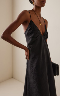 Amsterdam-based atelier Rohe offers exceptionally crafted staples in pair-with-anything neutrals that are as well-constructed as they are timeless. The dress features a floor-length strap design crafted from a hammered textured silk blend fabric with a soft matte finish. The captivatingly elegant design offers a deep gathered V-neckline in the front and a striking deep scoop open back detail. PRODUCT DETAILS - Spring '25 - Zip fastening - Composition: 75% silk, 25% nylon - Dry clean - Imported SIZE & FIT - Designed for a slim fit