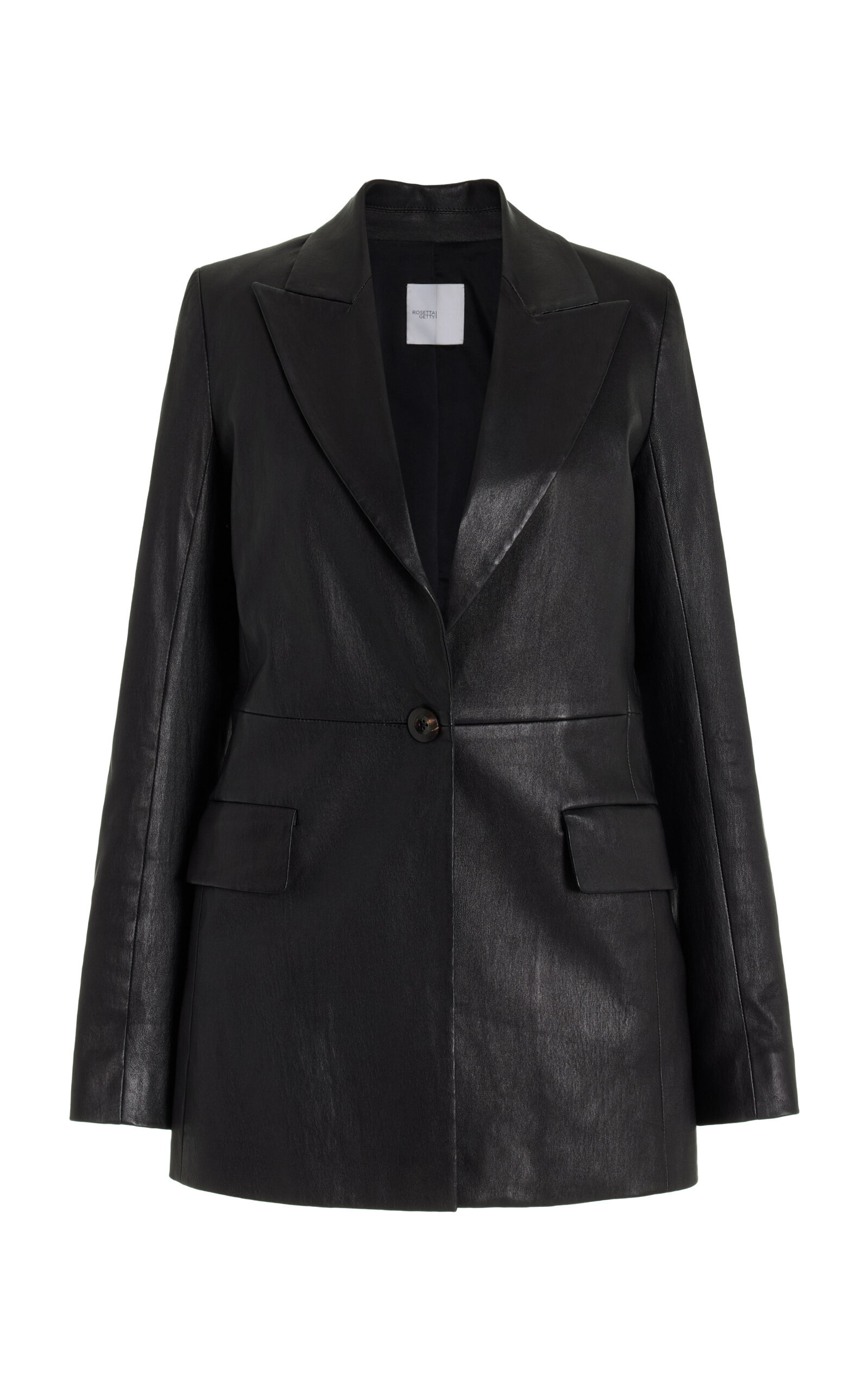 A signature Rosetta Getty style, this tailored blazer is an elevated iteration of the enduring Interlock Jersey staple. It features buttery-soft, stretch lambskin construction and is designed with sophisticated peak lapels and a longer silhouette; shaping seams provide a perfect fit. The center point of Rosetta Getty’s popular leather offering, this Stretch Plonge fabric pairs buttery-soft lambskin with a stretch cotton backing for a leisurely feel. Tanned in France, it has a sexy, slightly shiny finish while maintaining a substantial feel for structure and shape. PRODUCT DETAILS - Not eligible for expedited shipping - Button fastening at front - Composition: 100% Lambskin, Backing: 98% Cotton / 2% Elastane - Specialist clean - Made in the USA SIZE & FIT - Our model is wearing a size US 2 - Model is 5'10" with a 31.5" bust, 23.5" waist, and 35" hip