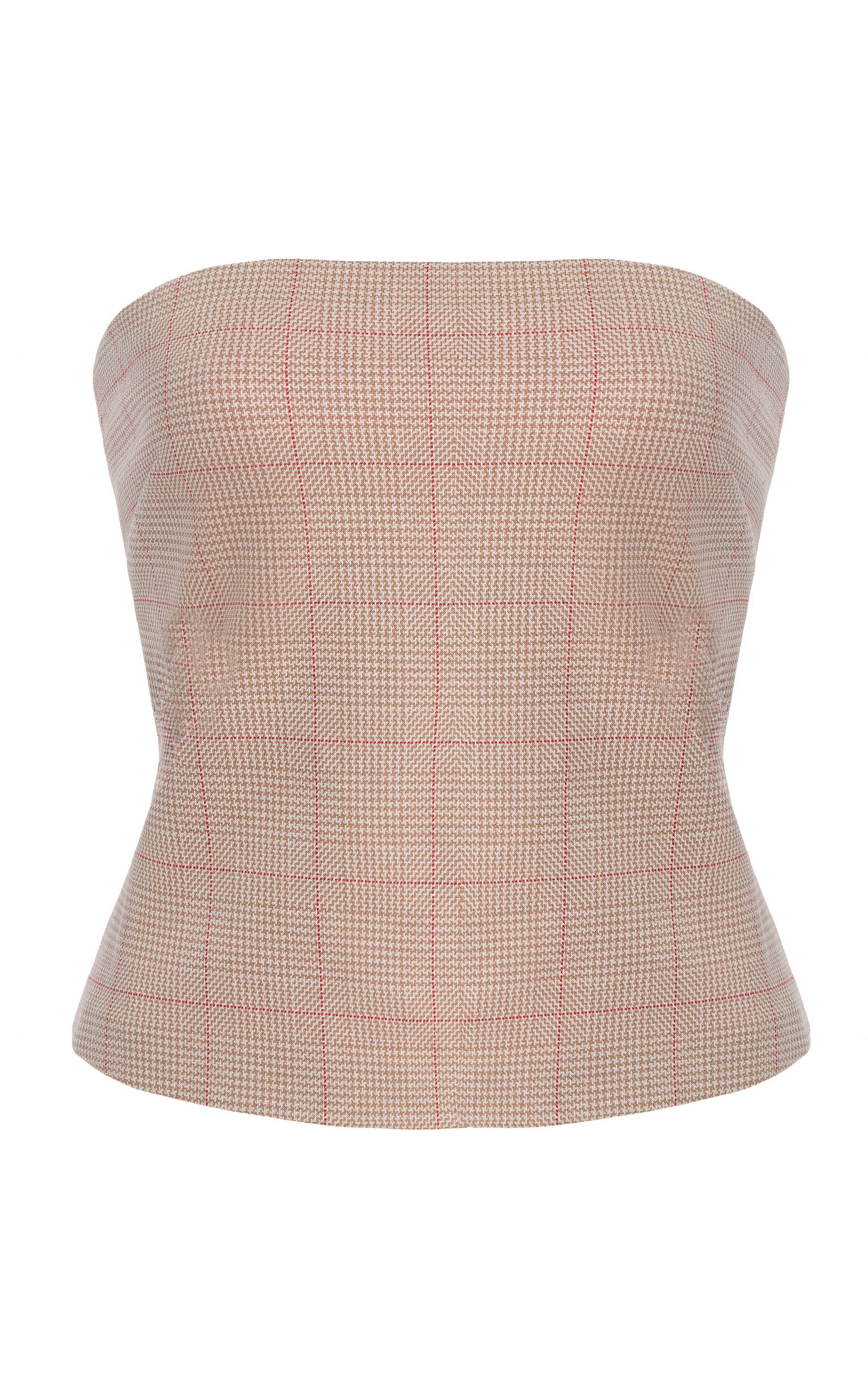 Rosetta Getty believes dressing should be effortless, so her basics are exceptionally versatile. Streamlined and versatile, this slim-fitting bandeau top is reminiscent of classic '90s styles. Rosetta Getty's seasonal Prince of Wales Plaid Interlock Jacquard lends classicism to the style, ideal for layering beneath the coordinating Peak Lapel Jacket. PRODUCT DETAILS - This item is not eligible for expedited shipping - Spring '25 - Concealed back zip - Composition: 62% Viscose, 18% Cotton, 14% Polyamide, 6% Elastane - Designer color: Caramel/ Red - Dry clean - Made in the USA SIZE & FIT - Our model is wearing a size Small - Model is 5'10" with a 30" bust, 24" waist, and 34" hip - Designed for a regular fit
