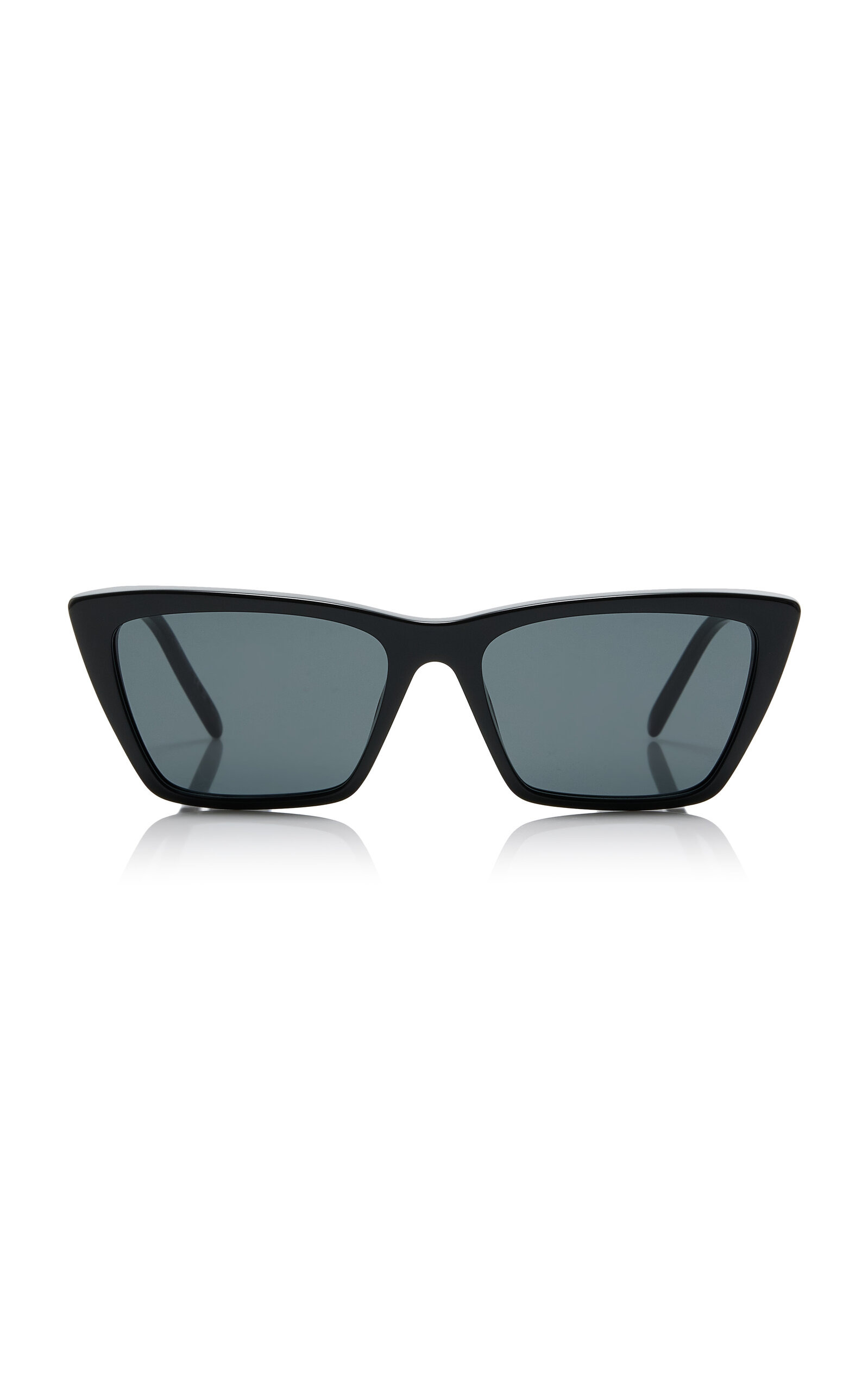 As bold and timeless as its ready-to-wear, Saint Laurent's sunglasses have been seen on the world's most stylish, like Hailey Bieber and Zoe Kravitz. The 'Mica' sunglasses are an angular take on a cat-eye frame, meaning they'll flatter your features even more than the classic silhouette, particularly those with round or heart-shaped faces. They've been made in Italy from hard-wearing acetate fitted with tinted black lenses to protect from the sun's harsh rays. PRODUCT DETAILS - Composition: 100% acetate - 100% UVA/UVB protection - Made in Italy