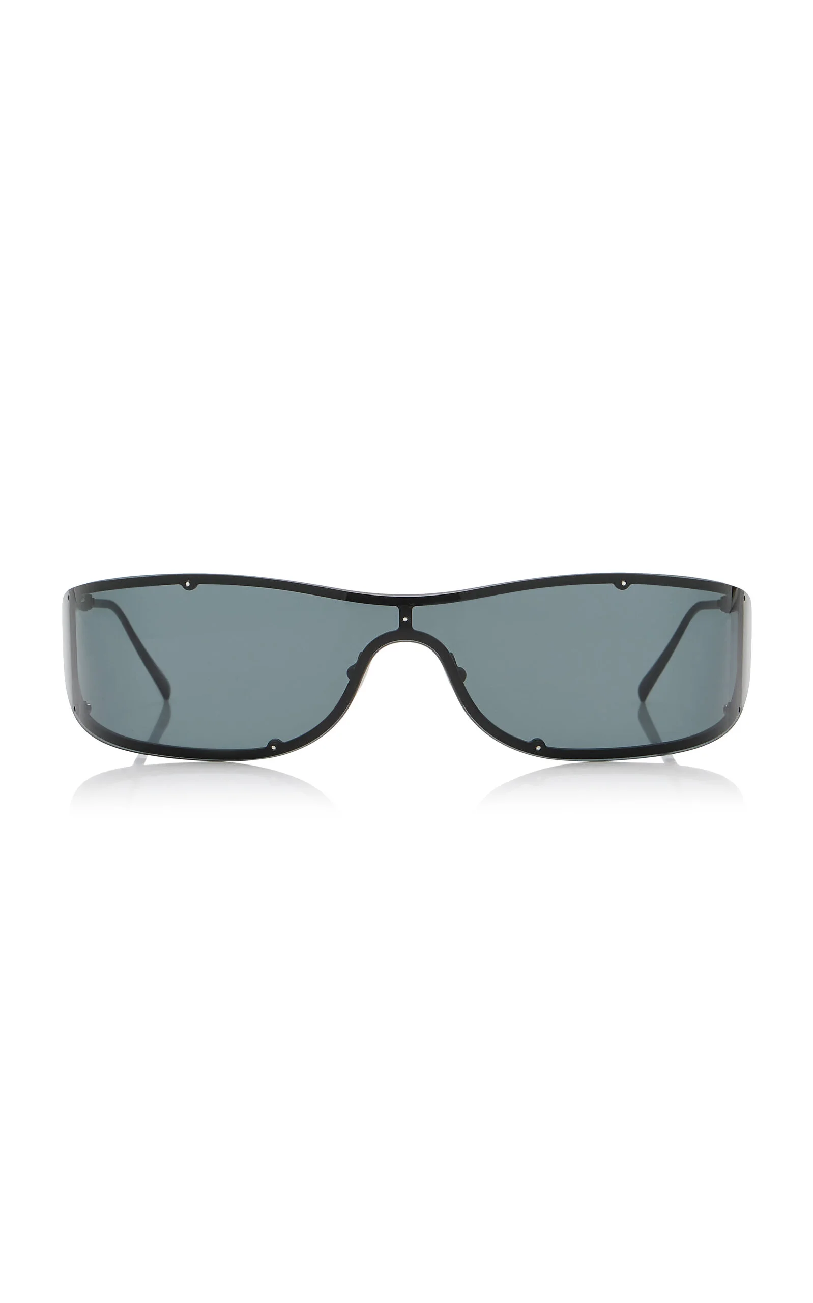 As bold and timeless as its ready-to-wear, Saint Laurent's sunglasses have been seen on the world's most stylish, like Hailey Bieber and Zoe Kravitz. These rimless shield sunglasses have metal frames and black nylon lenses. PRODUCT DETAILS - Composition: metal - 100% UVA/UVB Protection - Made in Japan