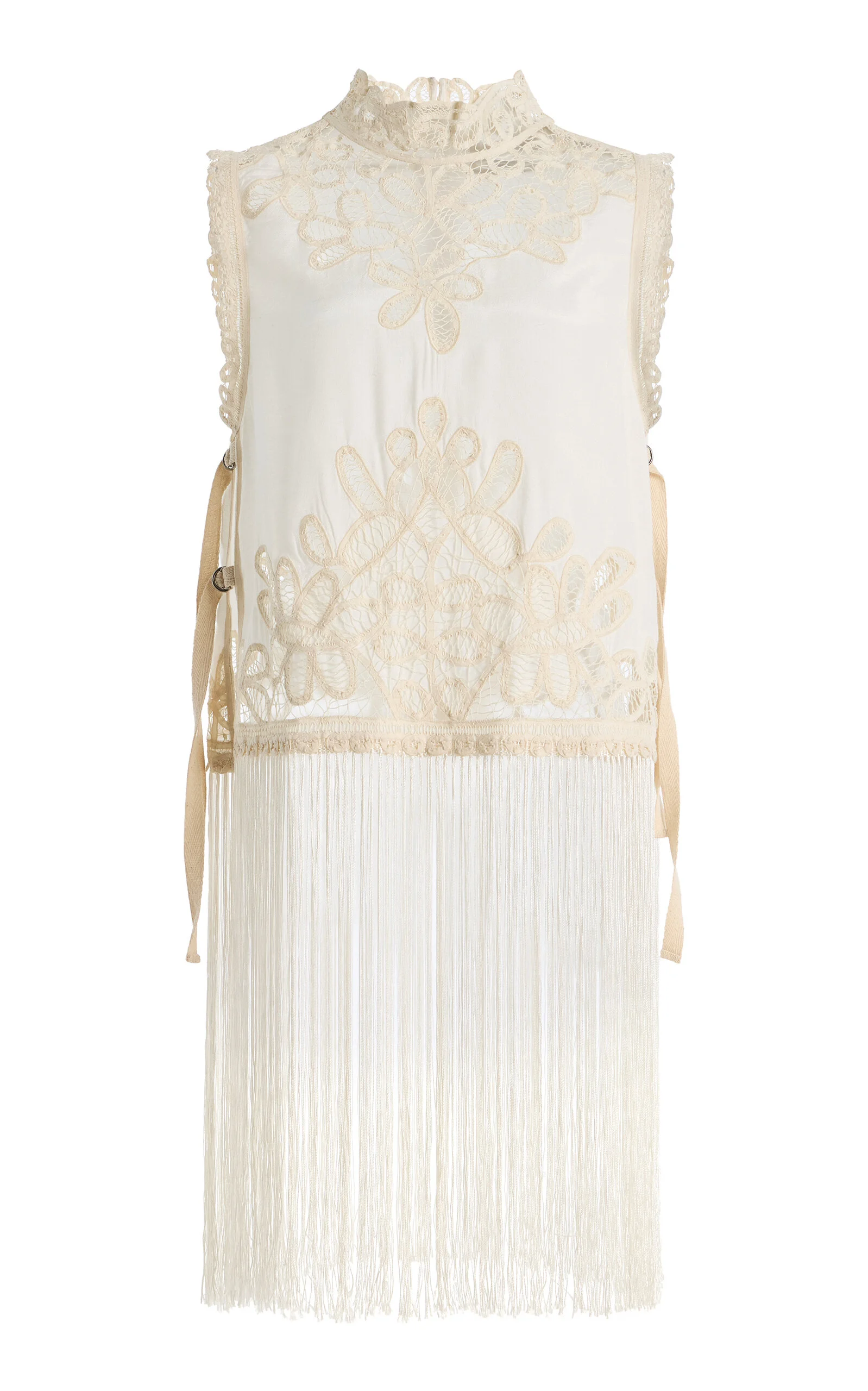 NYC-based Monica Paolini and Sean Monahan dream up pieces that resemble the perfect vintage find—and this season, they lean into their signature cool folksy-femininity. The Adelina top is made from intricate battenberg lace with a fringed hemline and adjustable D-ring webbed straps at the sides, creating a romantic and effortlessly feminine silhouette. PRODUCT DETAILS - Resort '26 - Button fastening at nape - Composition: 100% viscose; Combo: 100% cotton - Designer color: Cream - Dry clean - Imported