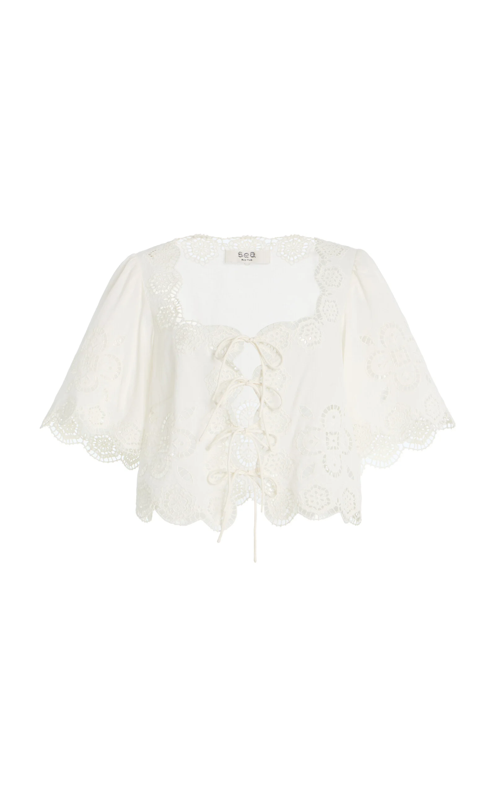 NYC-based Monica Paolini and Sean Monahan dream up pieces that resemble the perfect vintage find—and this season, they lean into their signature cool folksy-femininity. The ‘Babette’ top is crafted from 100% cotton with eyelet embroidery, flutter sleeves, scalloped edges, and adjustable lace-up ties through the front. Pair with the matching shorts to complete the set. PRODUCT DETAILS - Resort '26 - Tie fastenings through front - Composition: 100% cotton - Dry clean - Imported SIZE & FIT - Our model is wearing a size Small - Model is 5'9.5" with a 32" bust, 24" waist, and 35.5" hip