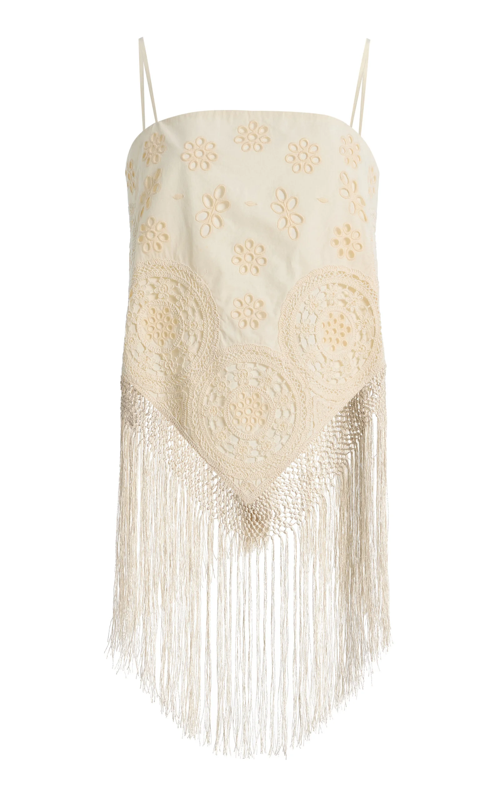 NYC-based Monica Paolini and Sean Monahan dream up pieces that resemble the perfect vintage find—and this season, they lean into their signature cool folksy-femininity. The Rafina eyelet top is crafted with intricate eyelet detailing throughout, finished with delicate spaghetti straps and a fringe hem that moves beautifully. It offers a soft, vintage-inspired statement for warm-weather days and evenings. PRODUCT DETAILS - Spring '26 - Zip fastening - Composition: 100% cotton; Lining: 100% cotton; Lace: 100% viscose; Embroidery: 100% polyester - Designer color: Cream - Dry clean - Imported