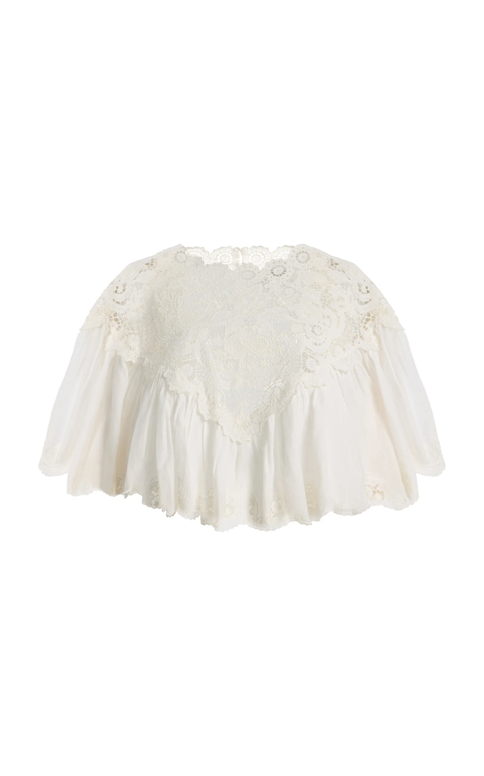 NYC-based Monica Paolini and Sean Monahan dream up pieces that resemble the perfect vintage find—and this season, they lean into their signature cool folksy-femininity. The Sofia embroidered top captures a sense of modern romance with intricate embroidery along the neckline, soft ruffle accents, and embroidered trim. Designed with a capelet-style cropped silhouette, it drapes beautifully and transitions seamlessly from day to evening. PRODUCT DETAILS - Spring '26 - Button fastening - Composition: 100% cotton; Embroidery: 100% polyester - Designer color: Cream - Dry clean - Imported