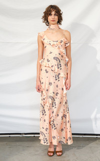 Ruffled satin maxi dress PRODUCT DETAILS - Resort '26 - Slim fit, asymmetric neckline with ruffled detailing, floral printed mesh and ruffled throughout, column silhouette maxi - Unlined - Composition: 100% Polyester - Zip Closure - *Machine wash warm (30°); Do not bleach; Do not tumble dry; Iron low heat (110°); Dry clean any solvent except Trichloroethylene - Made in Turkey