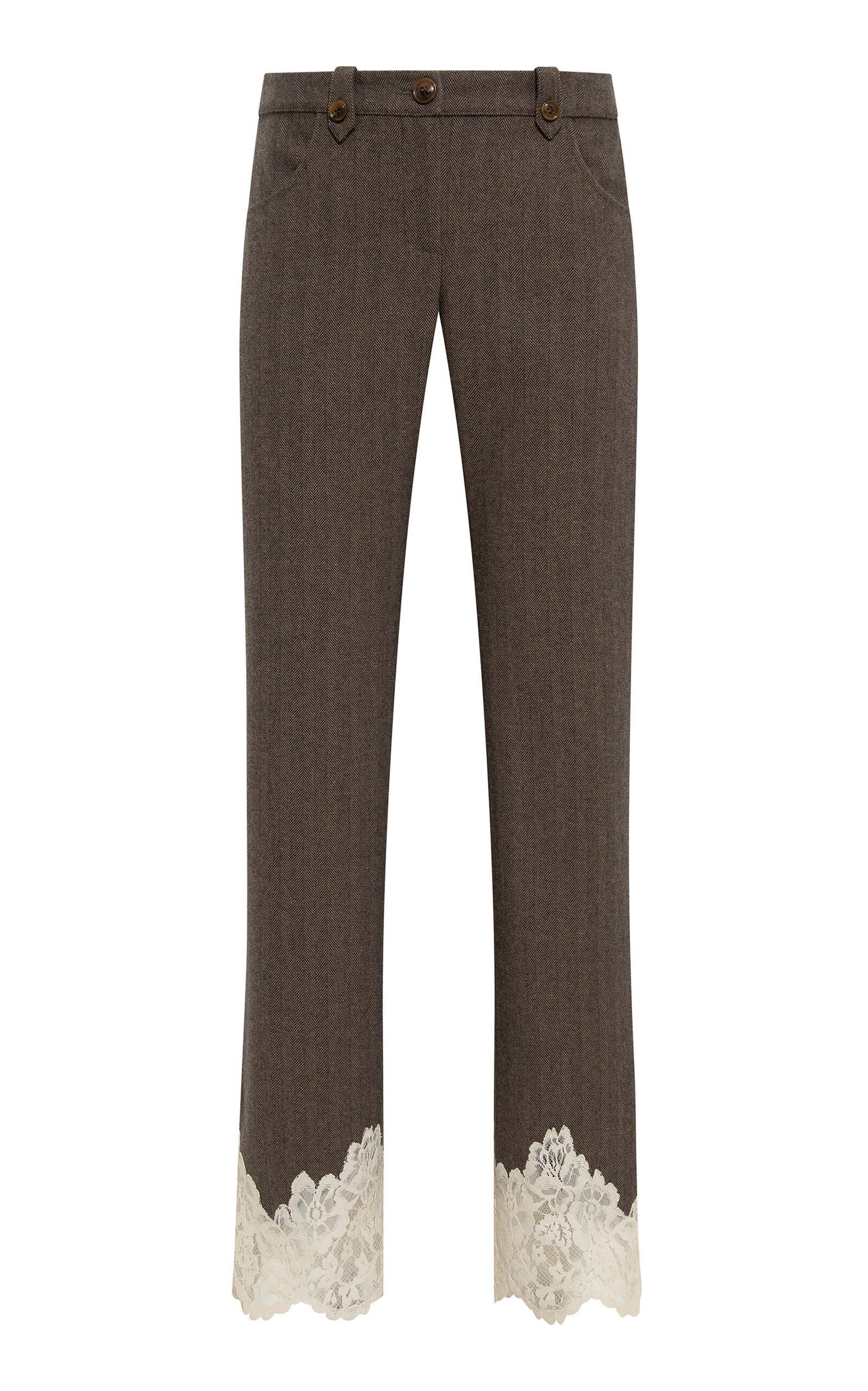Wool blend pants with lace-trimmed hem PRODUCT DETAILS - Fall/Winter '25 - Lace-trimmed hem, straight-leg, low-waisted - Composition: 60% Polyester 30% Wool 10% Viscose Details; 52% Polyamide 48% Organic Cotton Lining; 100% Polyester - Button and concealed zip fastening - *Dry clean only - Made in Turkey
