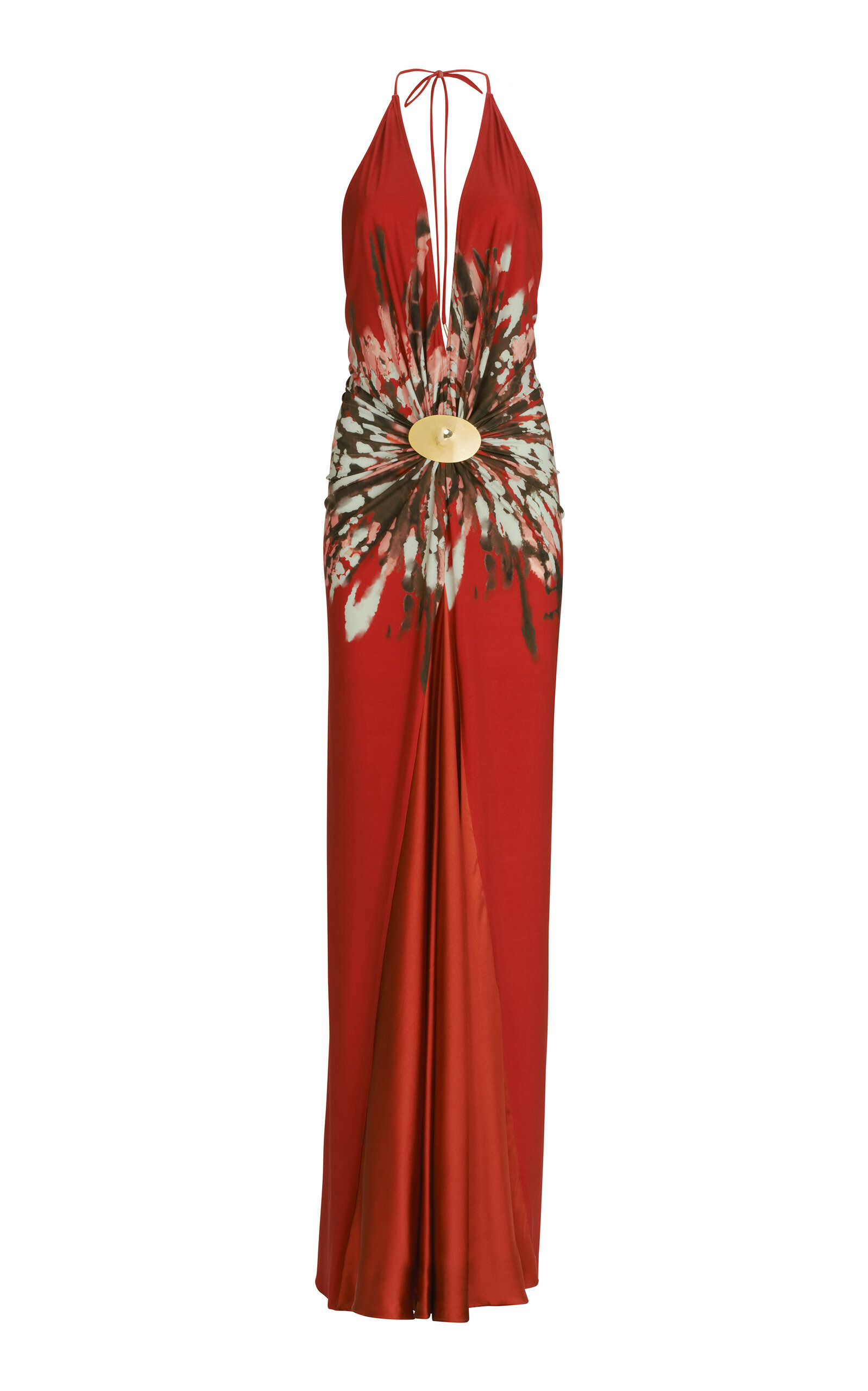 The Colombian designer crafts whimsical and feminine pieces that are imbued with unique stories rooted in her Latin upbringing. Fitted across the bodice with a biased-cut, panelled skirt, this ‘Aiko’ maxi can be adjusted across the neckline using the self-tie fastening. It’s made from stretch-satin with a bespoke print and gold-tone adornments. PRODUCT DETAILS - Fall/Winter ‘25 - Concealed zip fastening - Composition: 71% polyester, 18% silk, 12% elastane - Dry clean - Designer Color: Burnt Flower - Made in Colombia