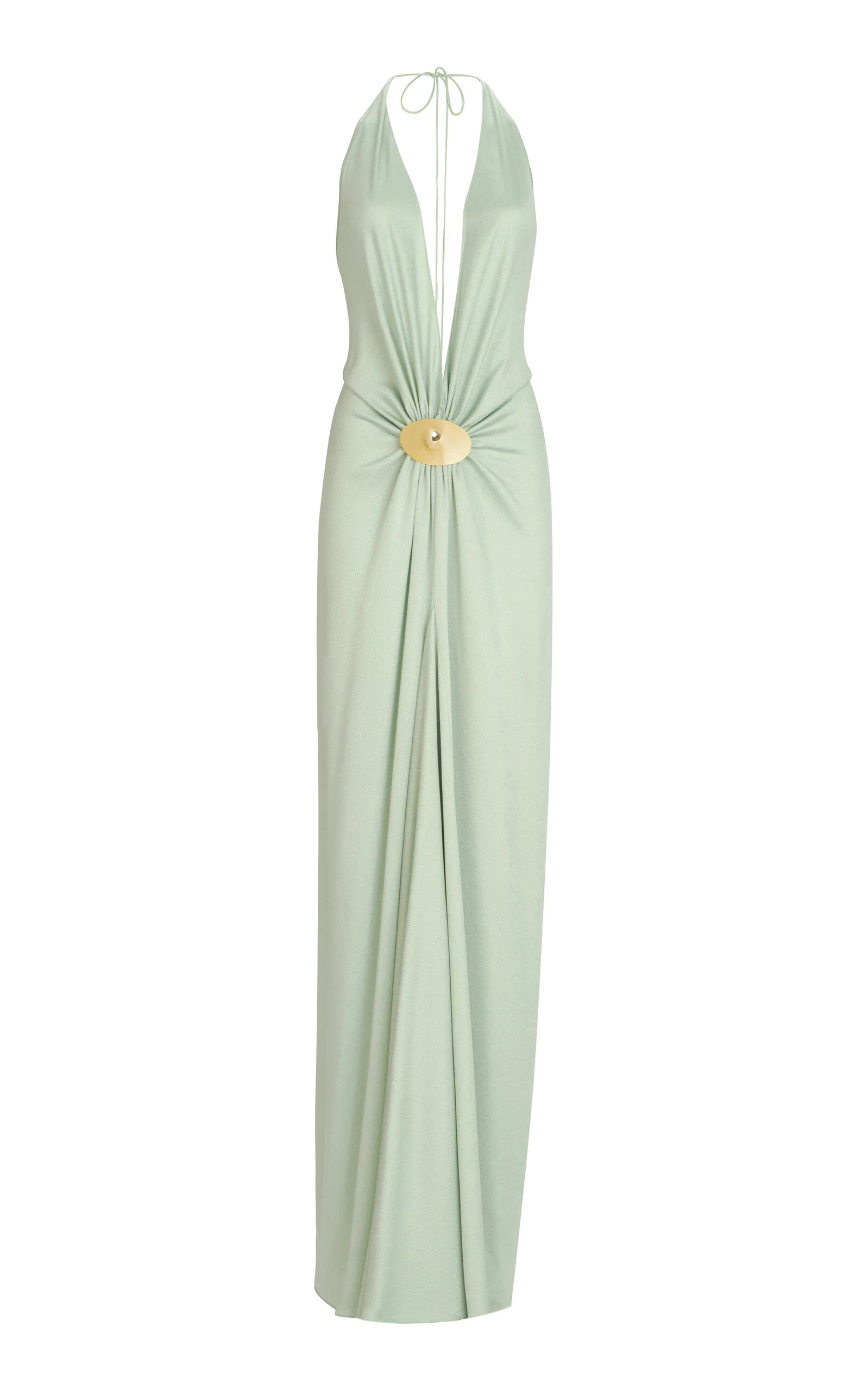 PRODUCT DETAILS - Sleeveless, plunged neck, gather with metal brooch, maxi hem - Concealed zip fastening - Unlined - Composition: 51% viscose 49% accetate - Color: light blue - Dry clean only - Pre-Fall '25
