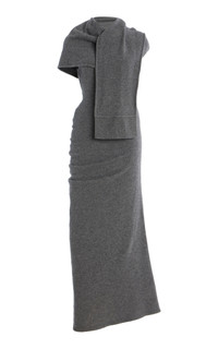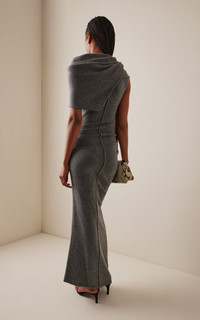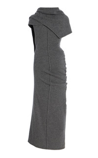PRODUCT DETAILS - Slim fit, scarfed neckline with draped detailing and cut out feature by the waist, column silhouette midi - Pull Over - Lined - Composition: 90% Wool 10% Cashmere - Color: grey - Dry Clean Only - Fall-Winter '25