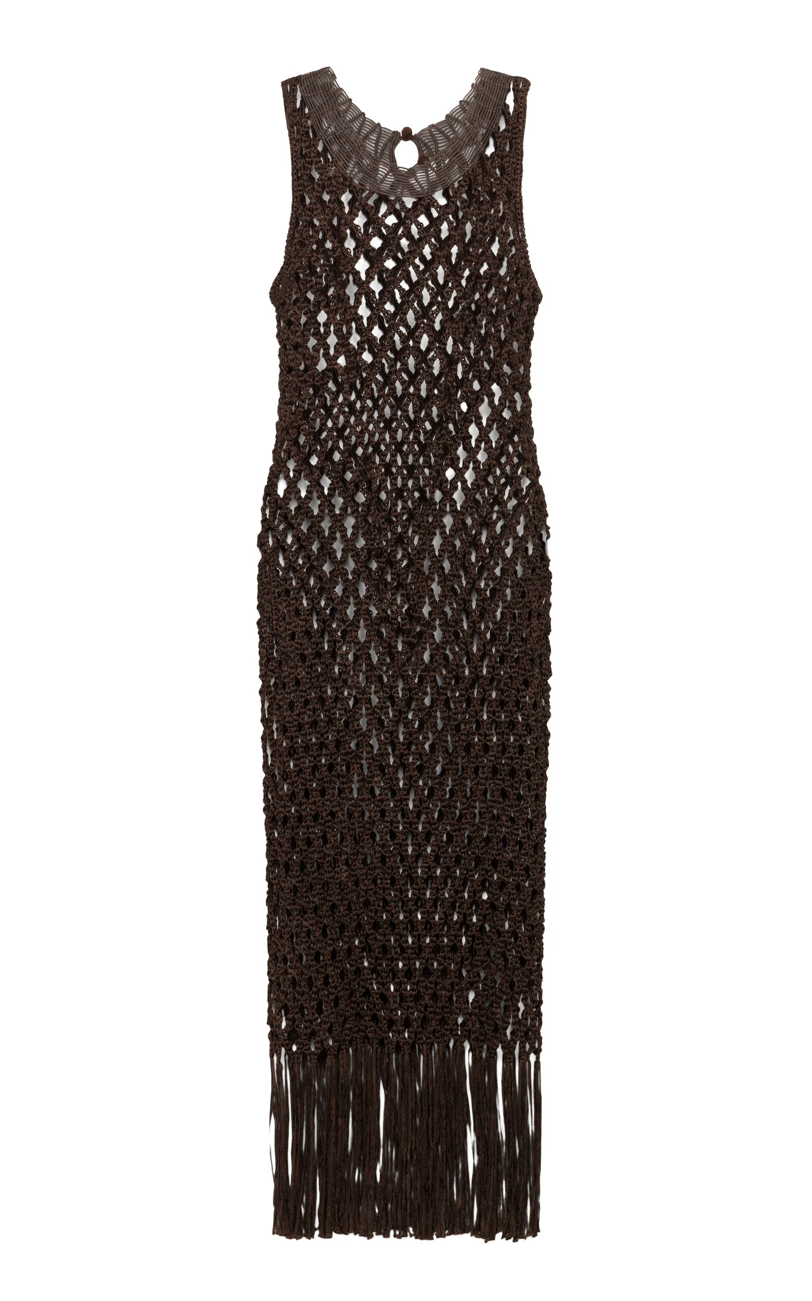Simkhai's range of luxury swimwear makes a statement on the beach. Crafted in braided macrame, this sleeveless midi cover-up is defined by its intricate texture and fluid silhouette. Fringe detailing at the hem adds movement and a refined finish. PRODUCT DETAILS - Spring '26 - Slip on - Composition: 100% polyester; Trim: 100% cotton - Designer color: Chocolate - Dry clean - Imported