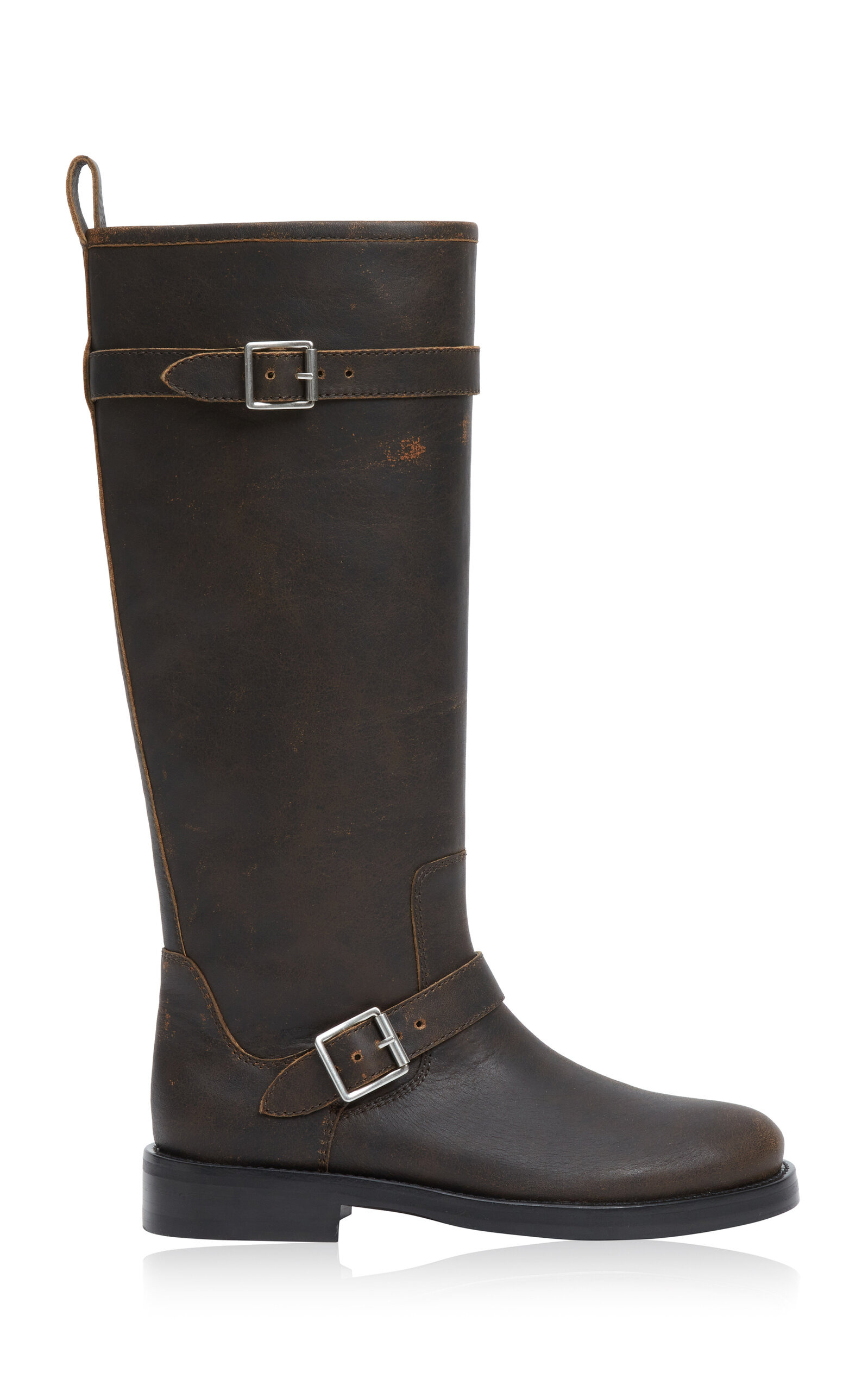 PRODUCT DETAILS - Knee boots silhouette, leather body, buckle details, lined - Pull on, buckle fastening - Composition: upper: 100% calf leather; lining: 100% sheepskin; outsole: 100% leather - Imported