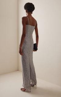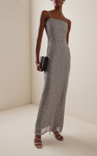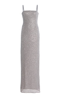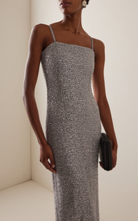 PRODUCT DETAILS - Slim fit, square neckline with petite straps, embroidered detailing throughout, column silhouette maxi - Zip Closure Through Back - Fully Lined - Composition: Shell: 85% Nylon 15% Polyester, Lining: 97% Polyester 6% Spandex - Color: silver - Dry Clean Only - Fall-Winter '25