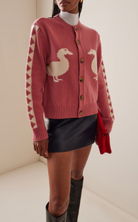 For Fall '25, the emerging talent (and a favorite of Harry Styles) evolves the heritage pieces that define British fashion into sleek yet playful standouts. The 'Jasper' Duck Cardigan is a signature piece of the brands inspired by a 1940s Oxford rowing team cardigan. This unique knit pays tribute to the historic "Mallard Song", sung by Oxford teams to boost spirit during rowing victories, and is beautifully reimagined with mirrored ducks crafted in dusty salmon pink and ecru tones. PRODUCT DETAILS - Fall '25 - Button fastening at front - Composition: 100% lambswool - Dry clean - Made in Portugal SIZE & FIT - Our model is wearing a size Small - Model is 5'9" with a 32" bust, 24" waist, and 35" hip