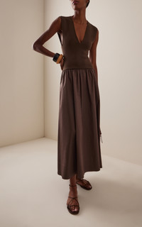 The clean-cut simplicity signature to the Bryon Bay label is never without cool ‘90s cuts. In the brand’s trademark natural and GOTS-certified materials, this season is a case in point — and proof that the coolest pieces needn’t always shout. This dress features a ribbed-knit bodice with a deep V-neckline and a full circle skirt made from sustainably sourced cotton. PRODUCT DETAILS - Fall '25 - Tie fastening - Composition: 53% viscose, 47% recycled polyester; Skirt: 100% BCI cotton - Designer color: Coffee - Dry clean - Imported SIZE & FIT - Our model is wearing a size Small - Model is 5'10" with a 31" bust, 23.5" waist, and 33.5" hip