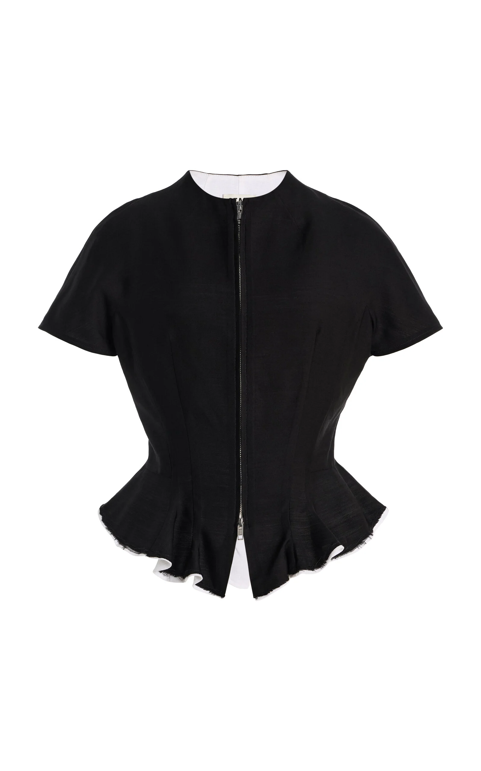 Sarah Staudinger and George Augusto co-founded the LA-based brand upon the idea that fashion shouldn't just empower women — it should be accessible, too. The 'Maelle' top has a sculptural silhouette made from raw-edge wool-silk with a contrasting lining to give the shape its structure. PRODUCT DETAILS - Resort '26 - Zip fastening through front - Composition: 48% wool, 32% viscose, 20% silk; Combo: 100% linen, Lining: 100% polyester - Machine wash - Imported