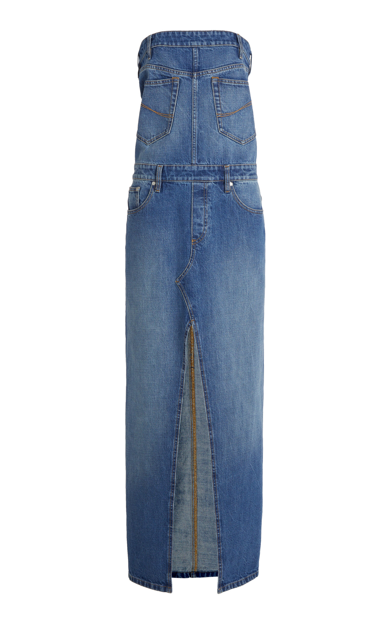 This season is a celebration of the Stella McCartney DNA. What is familiar becomes fresh again, as classic brand icons are made contemporary with wearability, desirability and, of course, sustainability. . The dress is cotton denim in medium vintage blue color features a strapless neckline with patch pockets detailing and a slit by the front, PRODUCT DETAILS - Pre-Fall '25 - Zip Fastening Through Back - Composition: 100% Cotton F: 50% Cotton; 50% Polyester SA: 73% Polyester; 27% Cotton - Designer color: Medium Vintage Blue - Dry clean only - Imported