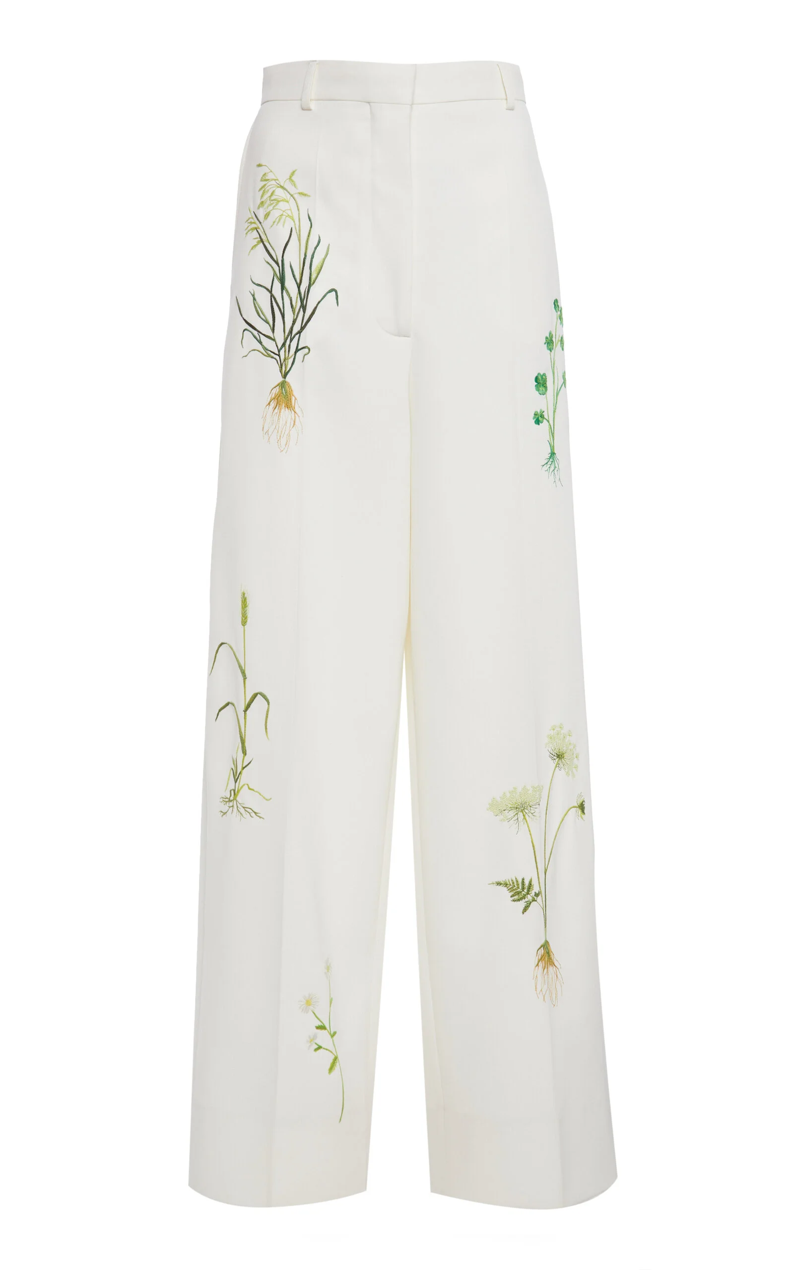 PRODUCT DETAILS - Relaxed fit, drop rise, wide-leg silhouette, side pockets, floral-embroidered details - Concealed hook and zip fastening along front - Unlined - Composition: 97% Wool, 3% Elastane - Color: ivory - Dry clean - Resort '25