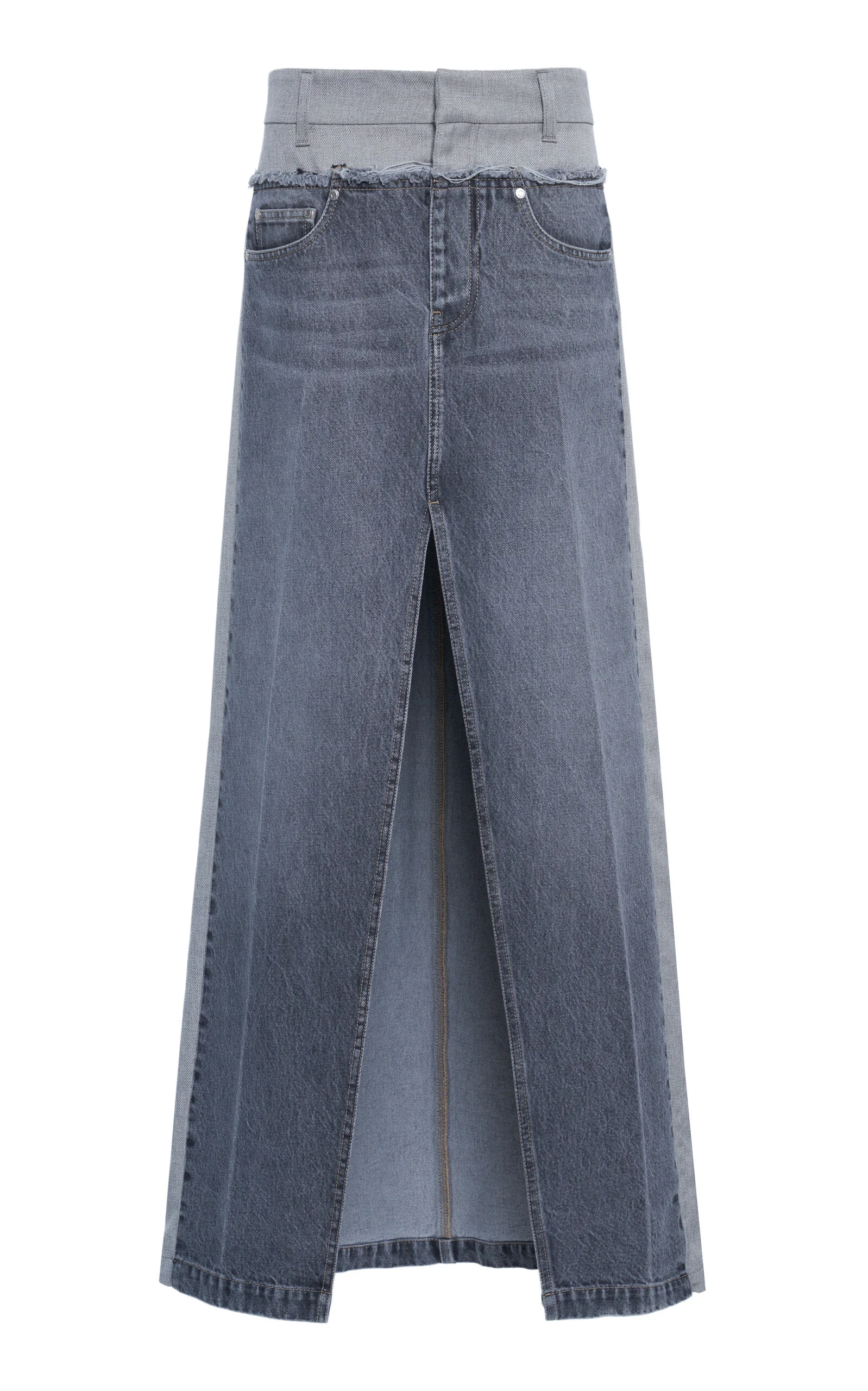 British designer Stella McCartney has become synonymous with 'sustainable fashion' that keeps the environment and community in mind. This deconstructed maxi skirt features a trouser waist spliced with raw-edge denim panels for a cool, upcycled look. PRODUCT DETAILS - Resort '26 - Concealed zip and hook fastening - Composition: 100% Cotton; 100% Polyester - Dry clean only - Made in Italy SIZE & FIT - Designed for a regular fit