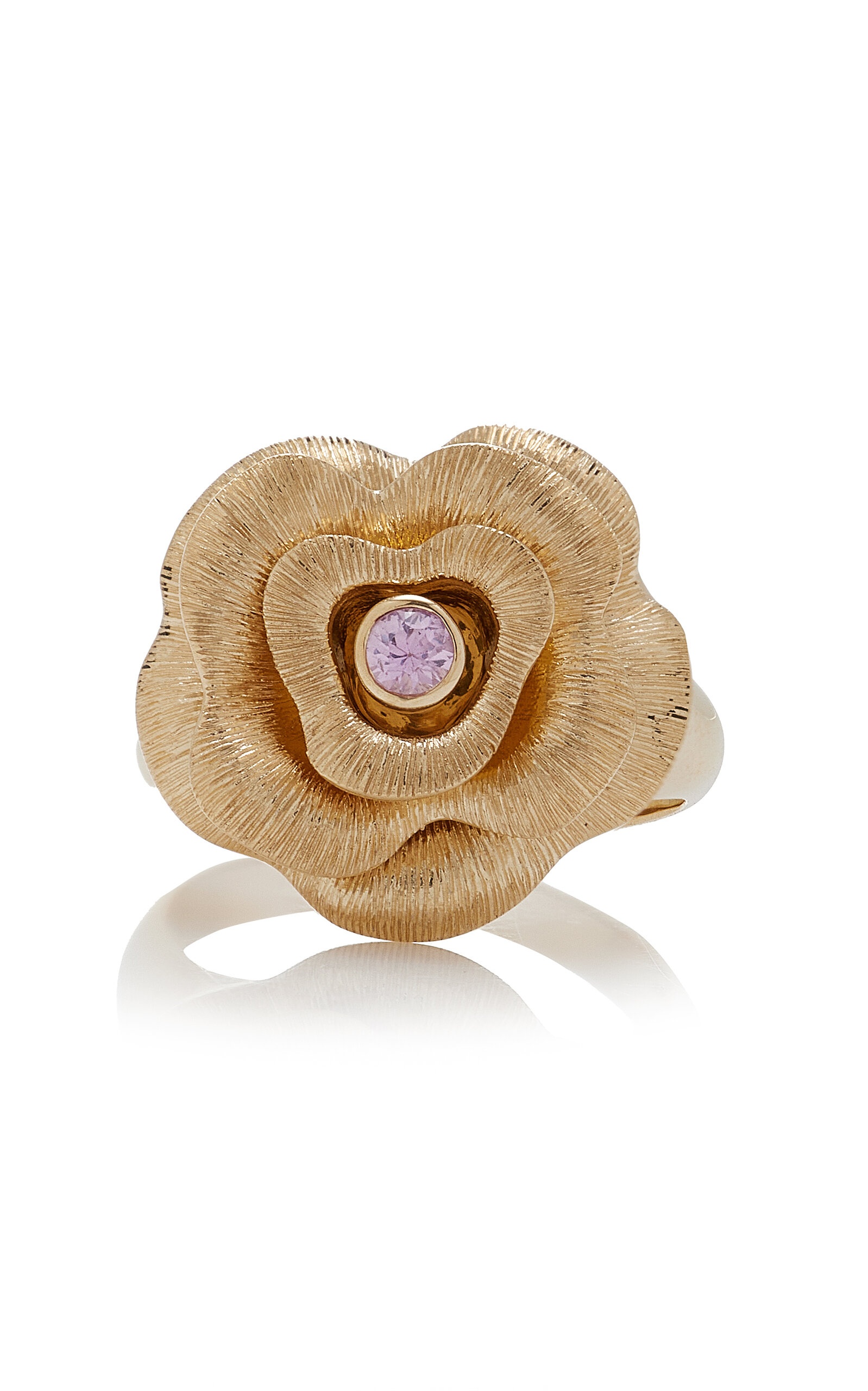 Since 2001, L.A. designer Rosanne Karmes has captured a blend of whimsy and spirituality that’s made her an A-list favorite. In this selection, find playful spins on charms and motifs that are said to inspire happiness and protection. This ring features a rose cast from 14k yellow gold bezel-set with a pink sapphire center stone. PRODUCT DETAILS - Composition: 14k yellow gold 13.37g, pink sapphire 0.101ct - Imported - Please note the possibility of natural inclusions in gemstones SIZE & FIT - This item measures 1 x 0.75"