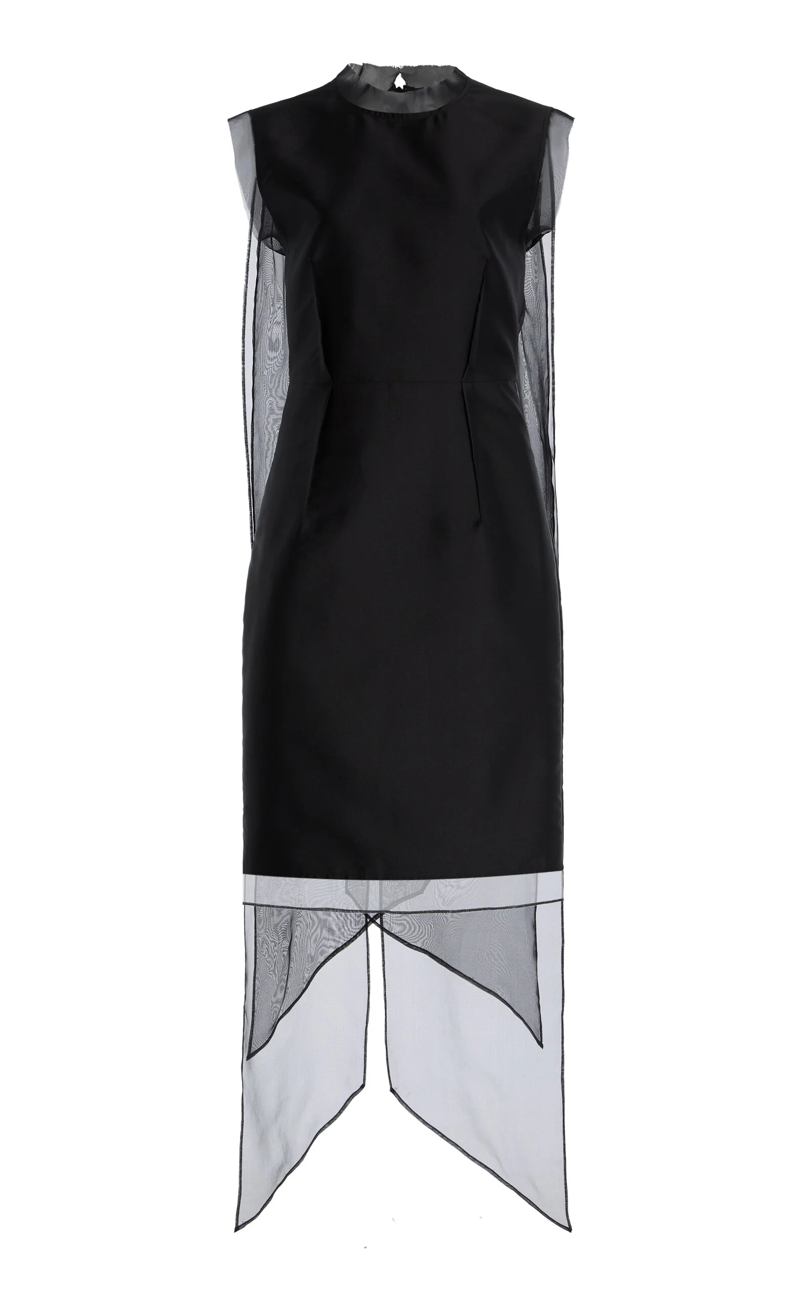 Dress with sheer contrast fabric and CB drape PRODUCT DETAILS - Fall-Winter '25 - Slim fit, rounded neckline with cap sleeves, draped detailing by the hemline, shift silhouette - Lined - Composition: Main: 100% Silk Second: 15% Silk 85% Polyester - Zip Closure Through Back - *Dry clean only - Made in China